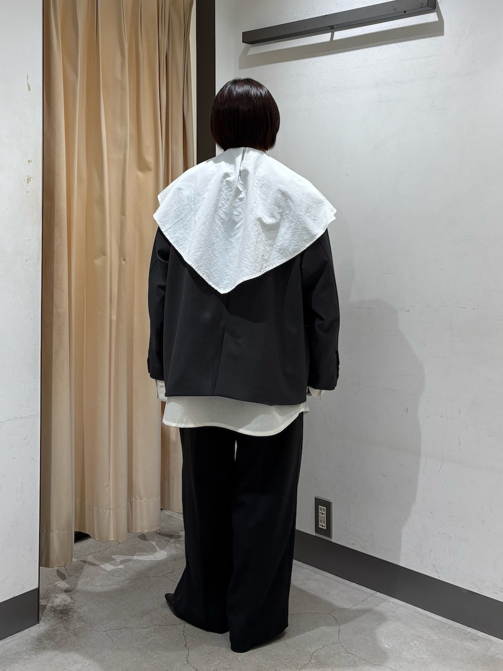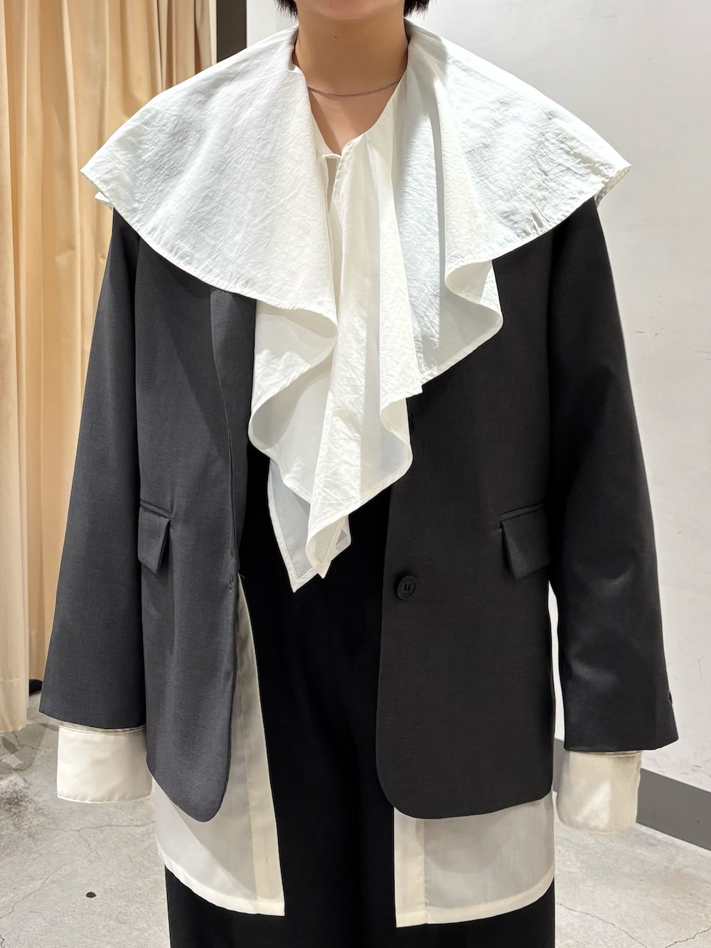 ラッフルカラーはそのまま垂らしても、前で1つくくりしてもらうとスカーフ風になります!