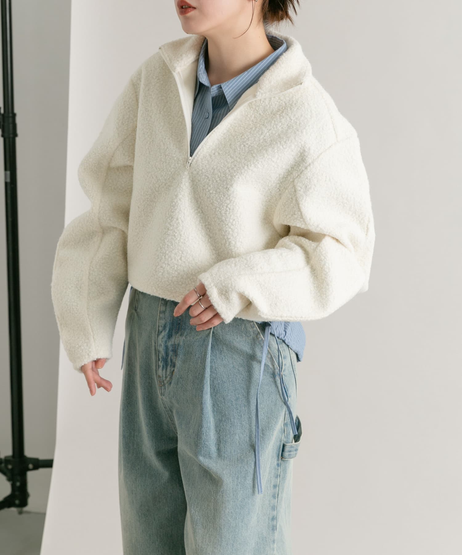 程よくクロップド丈なのでハイウエストのボトムと相性抜群です!デニム合わせや中にハイネックのインナーをレイヤードするのも可愛いです♡骨格ストレートさんはジップを下げて首元スッキリめで着ると着膨れしません✌🏻