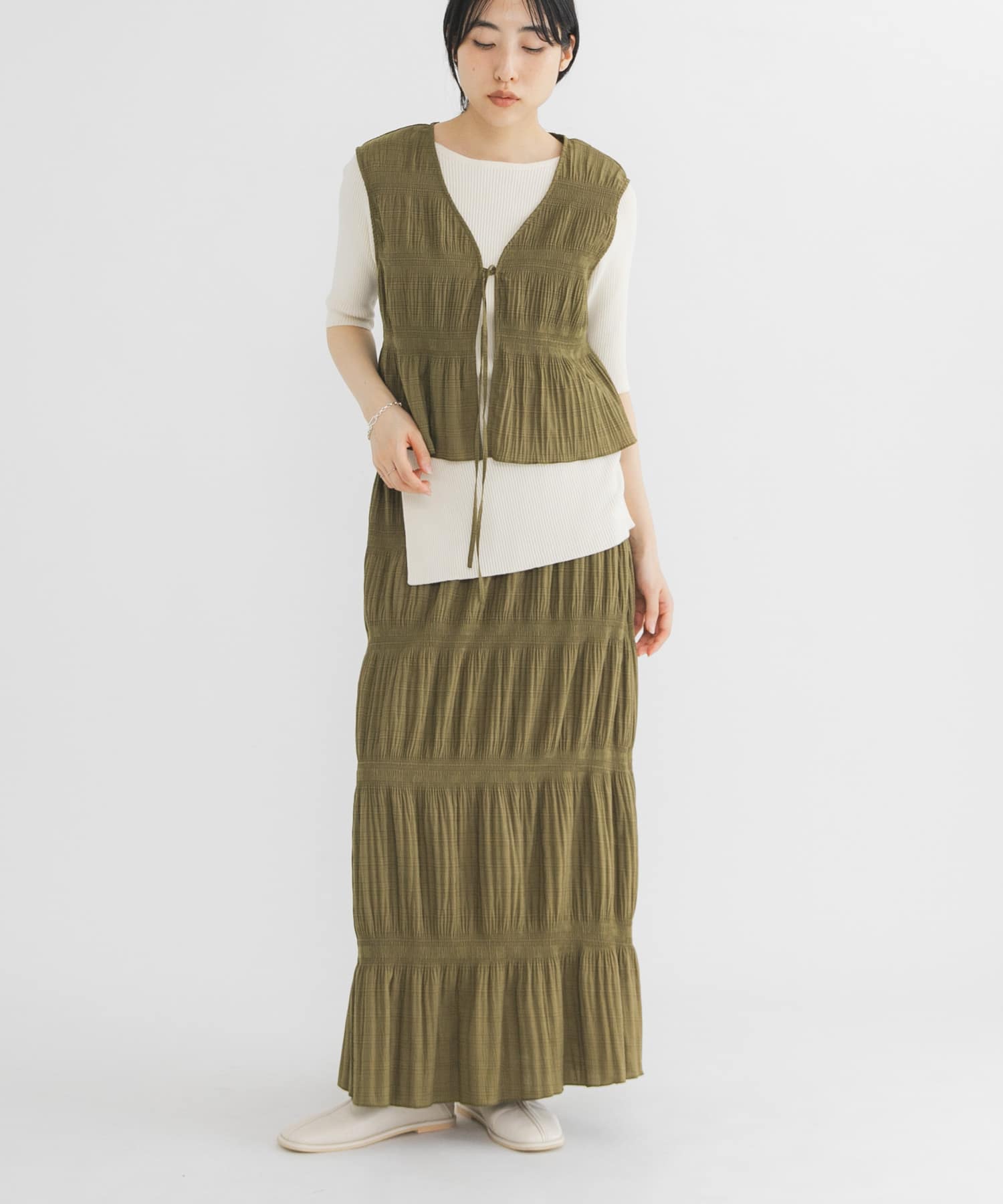 スカートとベスト、セットでの販売となります!今回はベストのみを使用しました。お手持ちのTシャツに1枚ベストを合わせるだけで、春らしいコーデになりますよー!