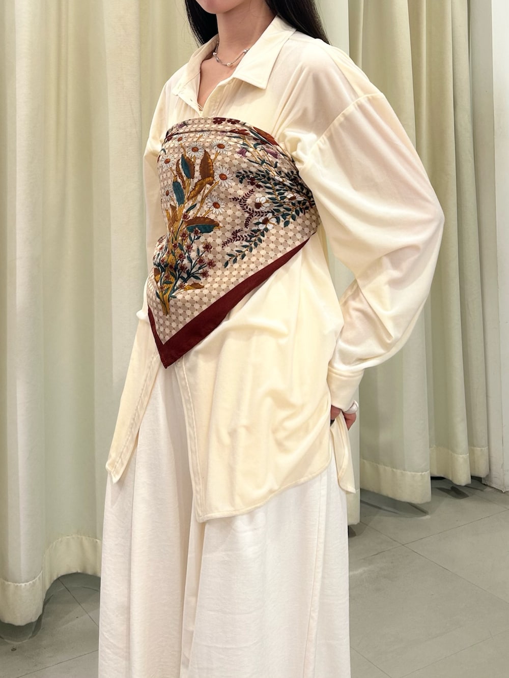 アイボリーのベロアシャツに、ヴィンテージライクなスカーフをビスチェ風にレイヤードしました🌟