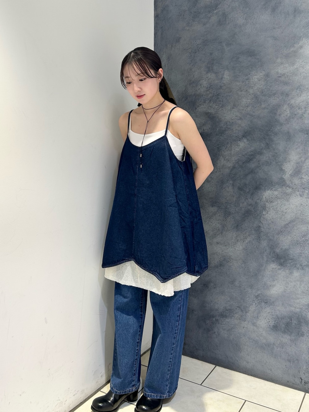 メッシュレイヤードデニムキャミワンピース