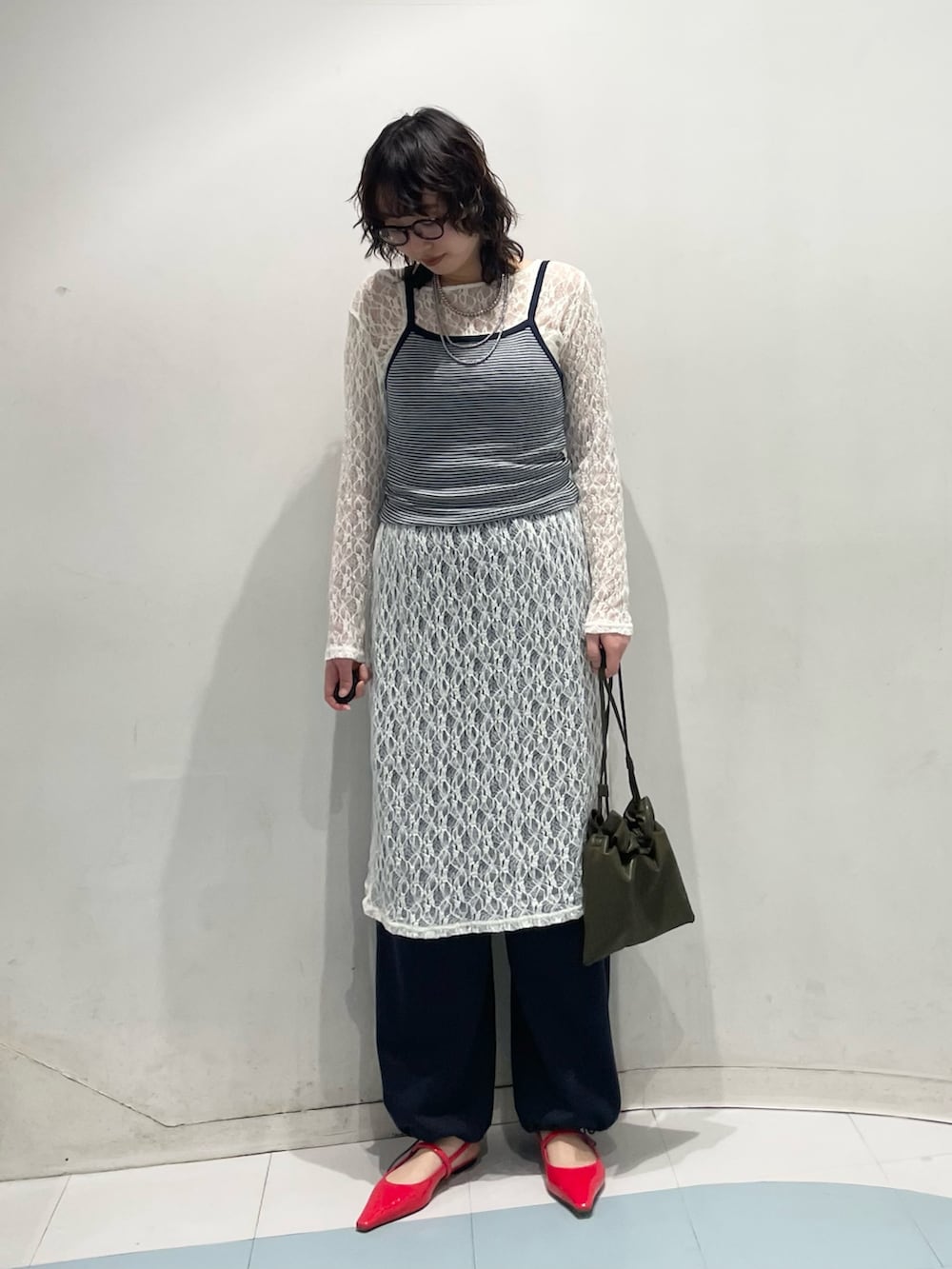 キャミソールとスウェットパンツの色味を統一すると、要素がたくさんあっても、一体感が生まれます。