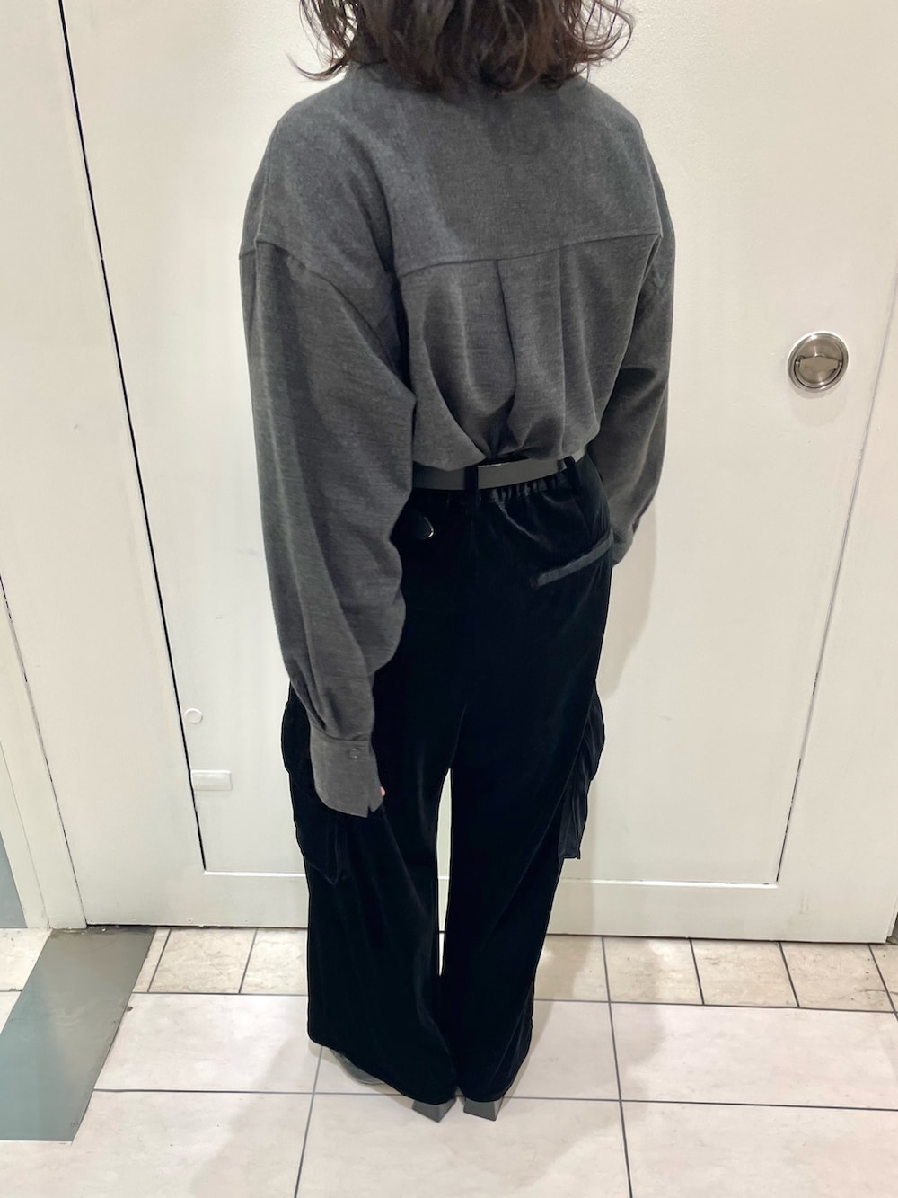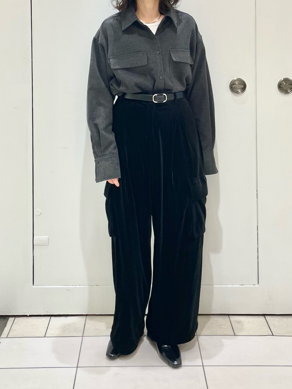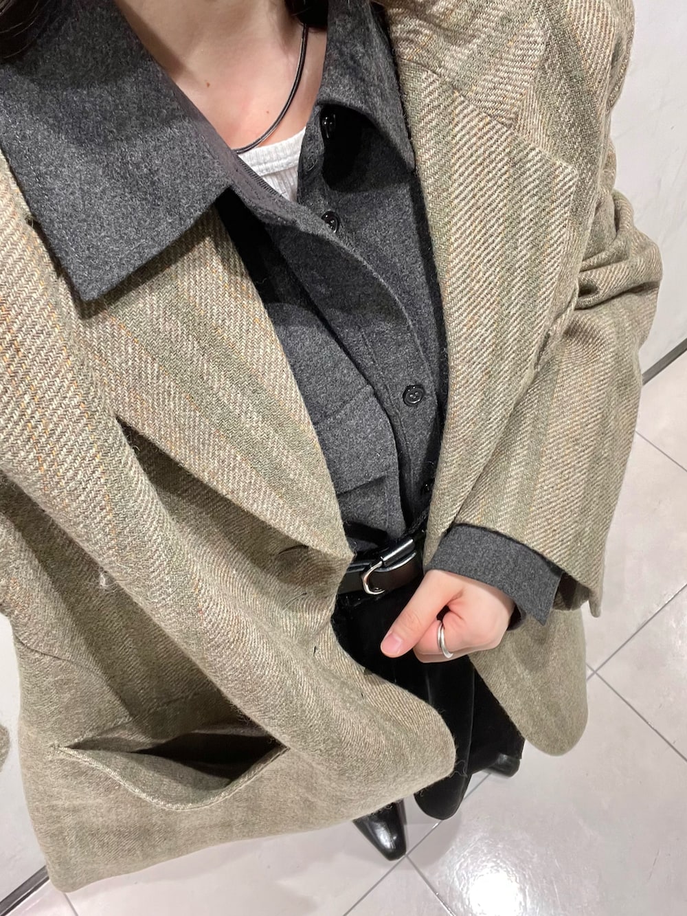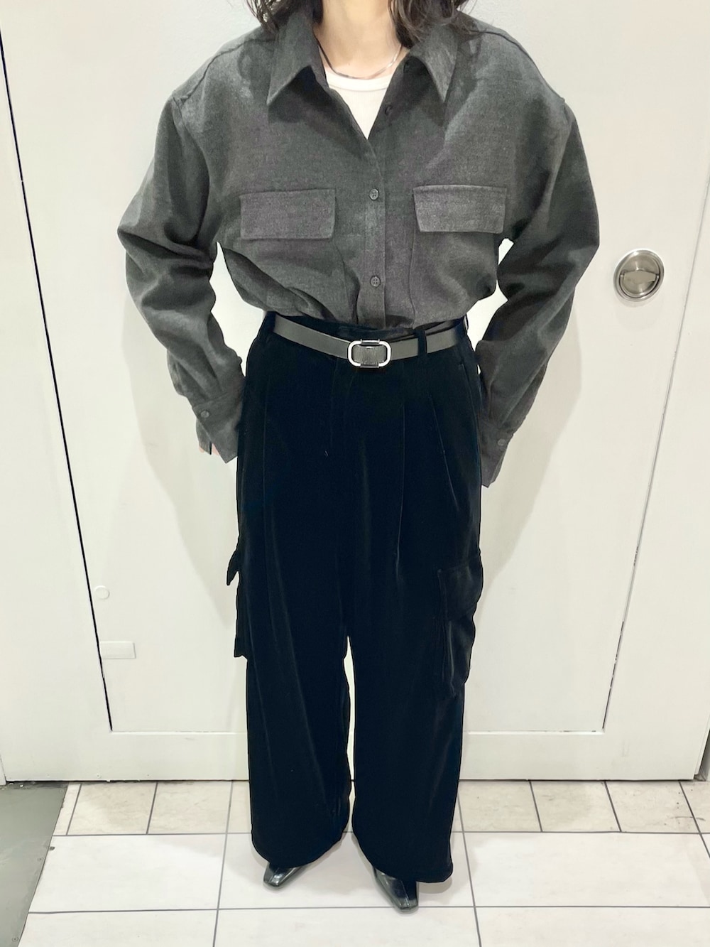 中に大きめのフーディやミドル丈のニット合わせもカジュアルで可愛いですが、着丈長めなウールMIXシャツをパンツインしてメンズライクに着ました。