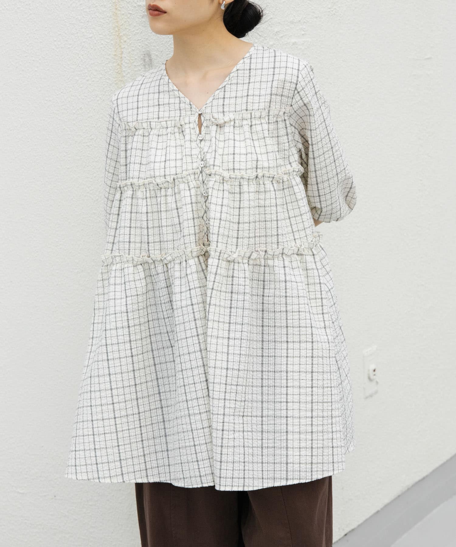 ふんわりとした形が可愛らしいサッカーチェックミニワンピースにスウェットパンツを合わせたゆるっとコーデです!