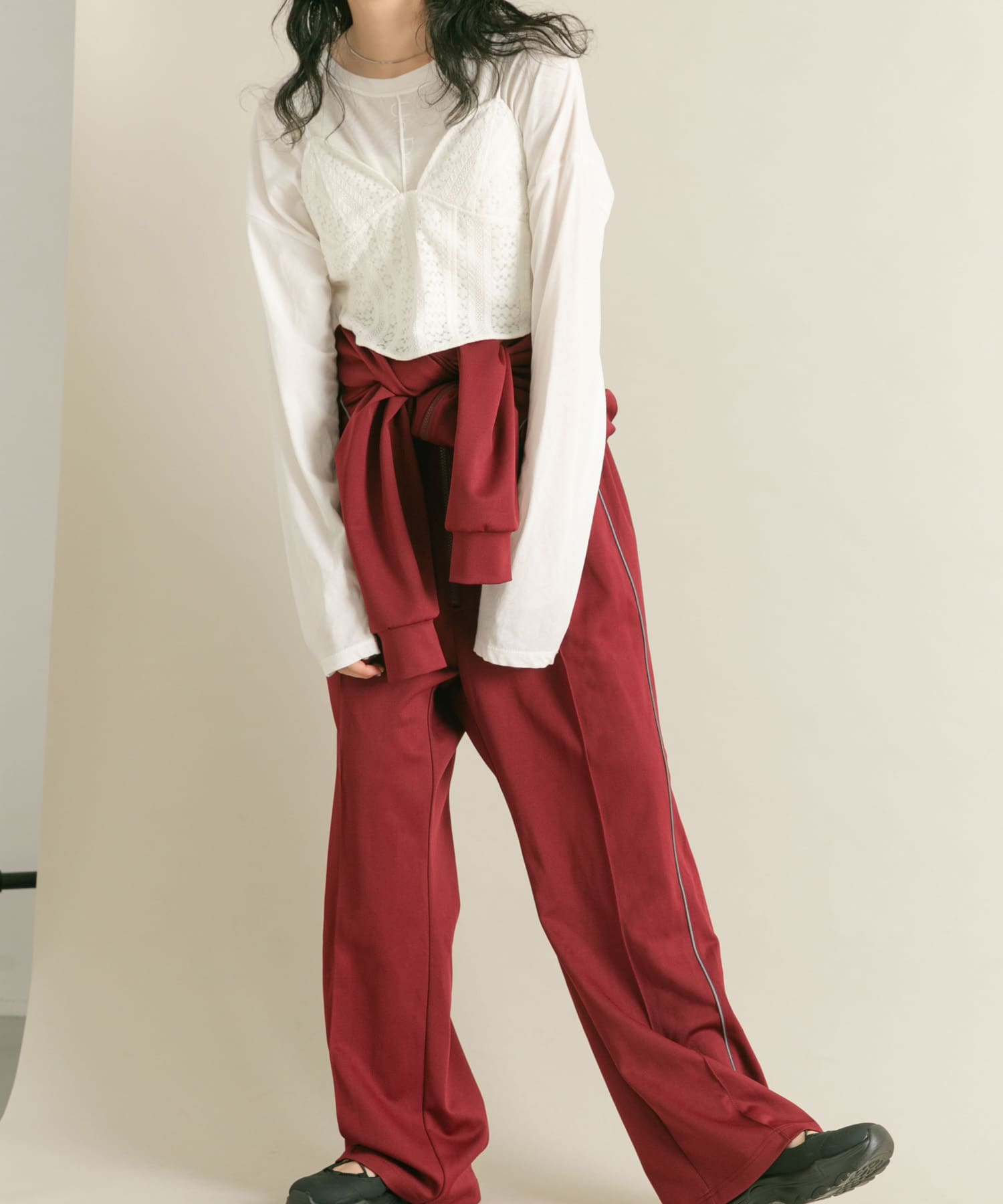 ボルドーカラーのトラックジャンプスーツをメインに着てみました。