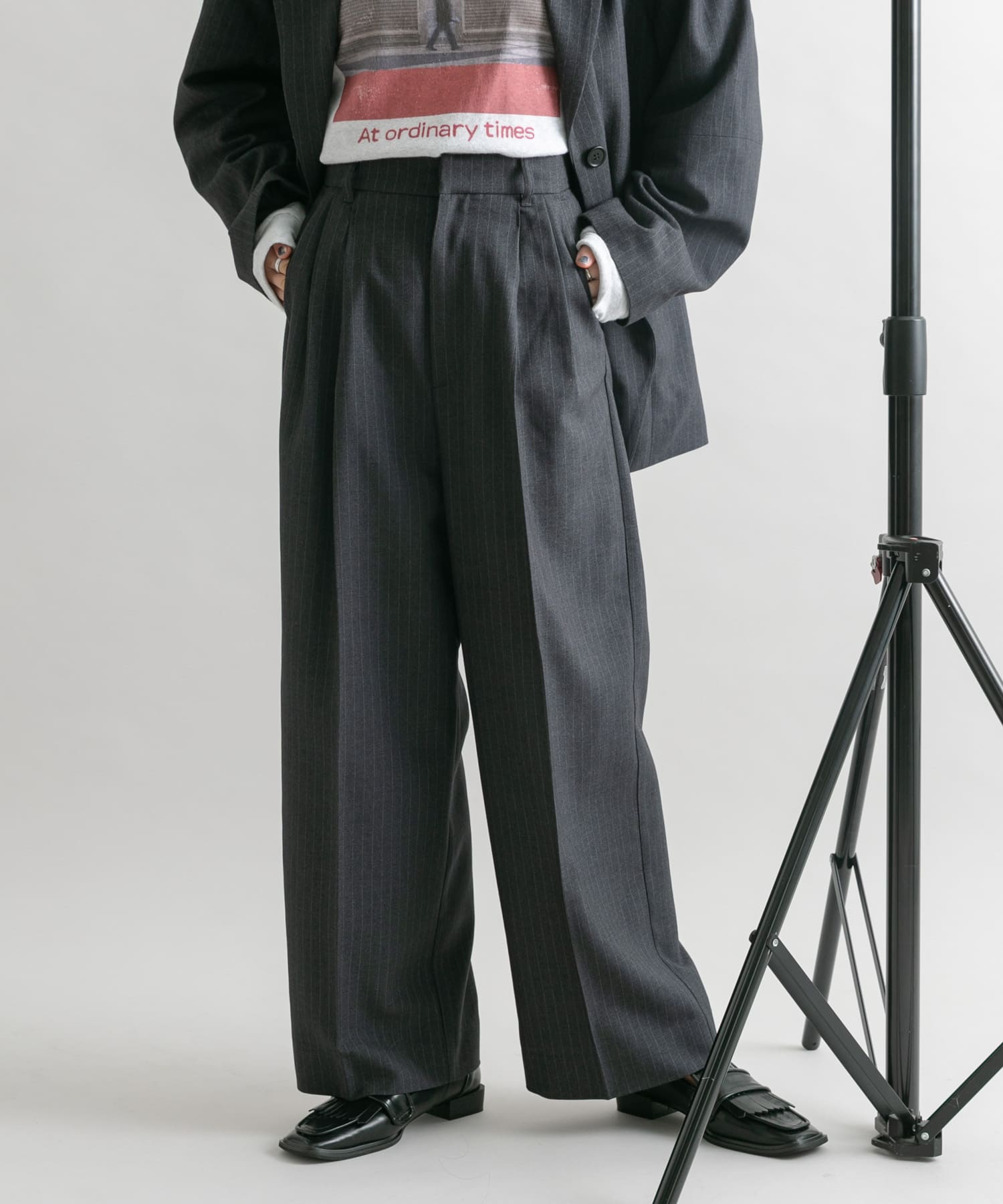 ネイビーのラッフルカラーブラウスに、グレーストライプのスラックスを合わせて、綺麗めカジュアルなスタイルにしてみました。