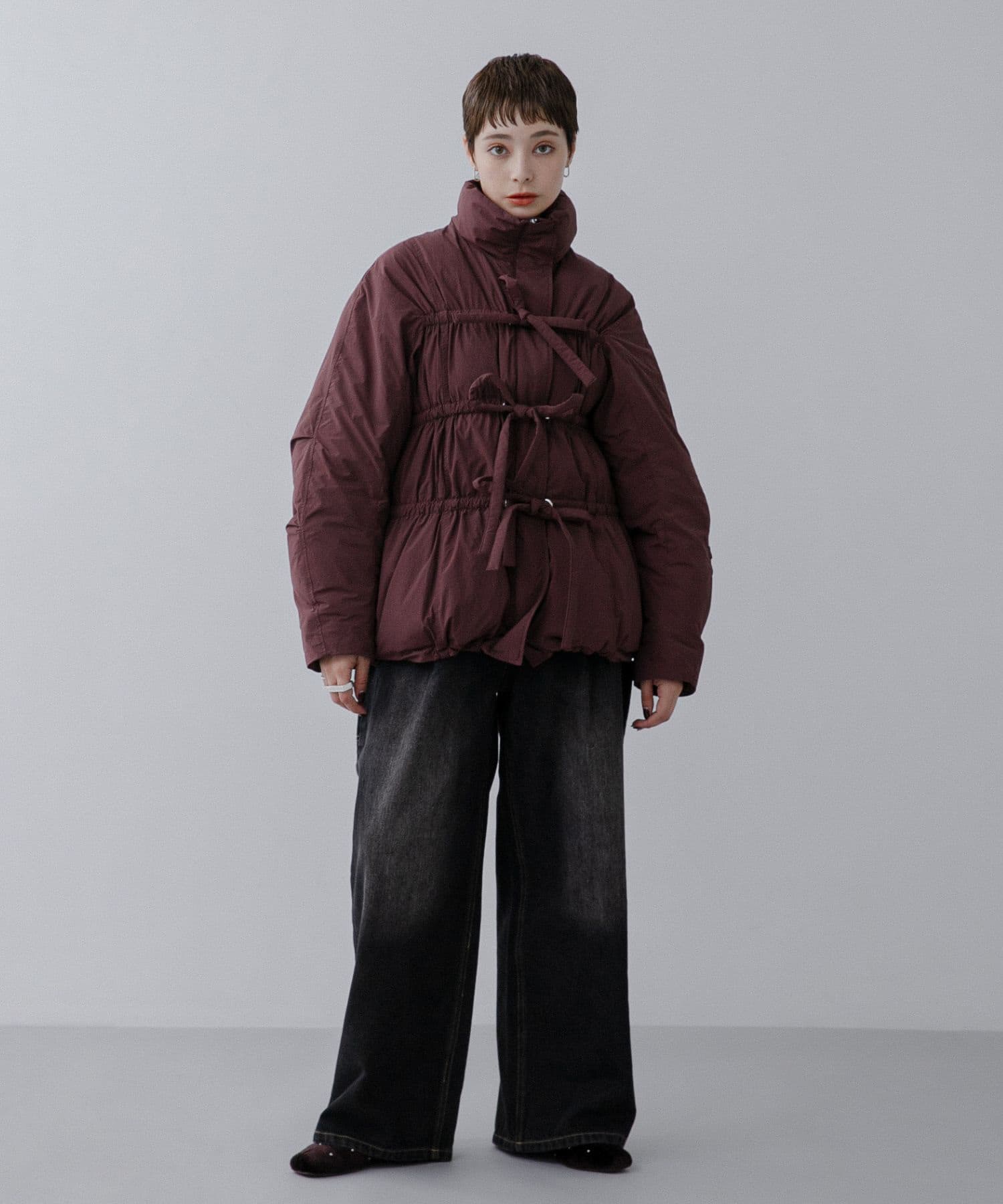 ボルドーカラーのフロントリボン中綿ジャケットをメインに、白のミニシャツワンピースとブラックのデニムを合わせて、カジュアルコーデにしてみました。