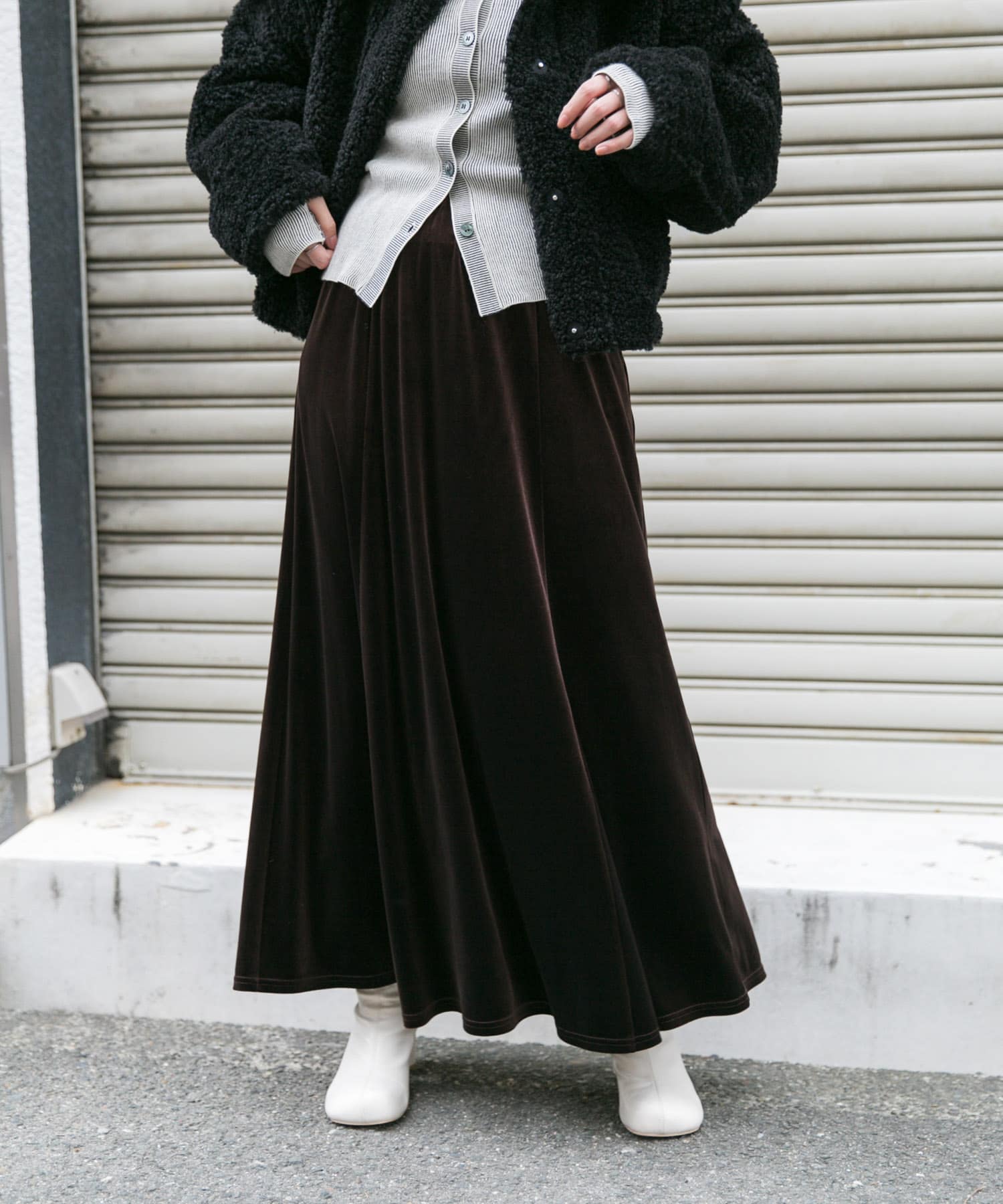 ベロアスカートは程よい厚みとセミフレアのシルエットで、身体のラインを拾わずすっきりきれいに着用できるのでおすすめです✨