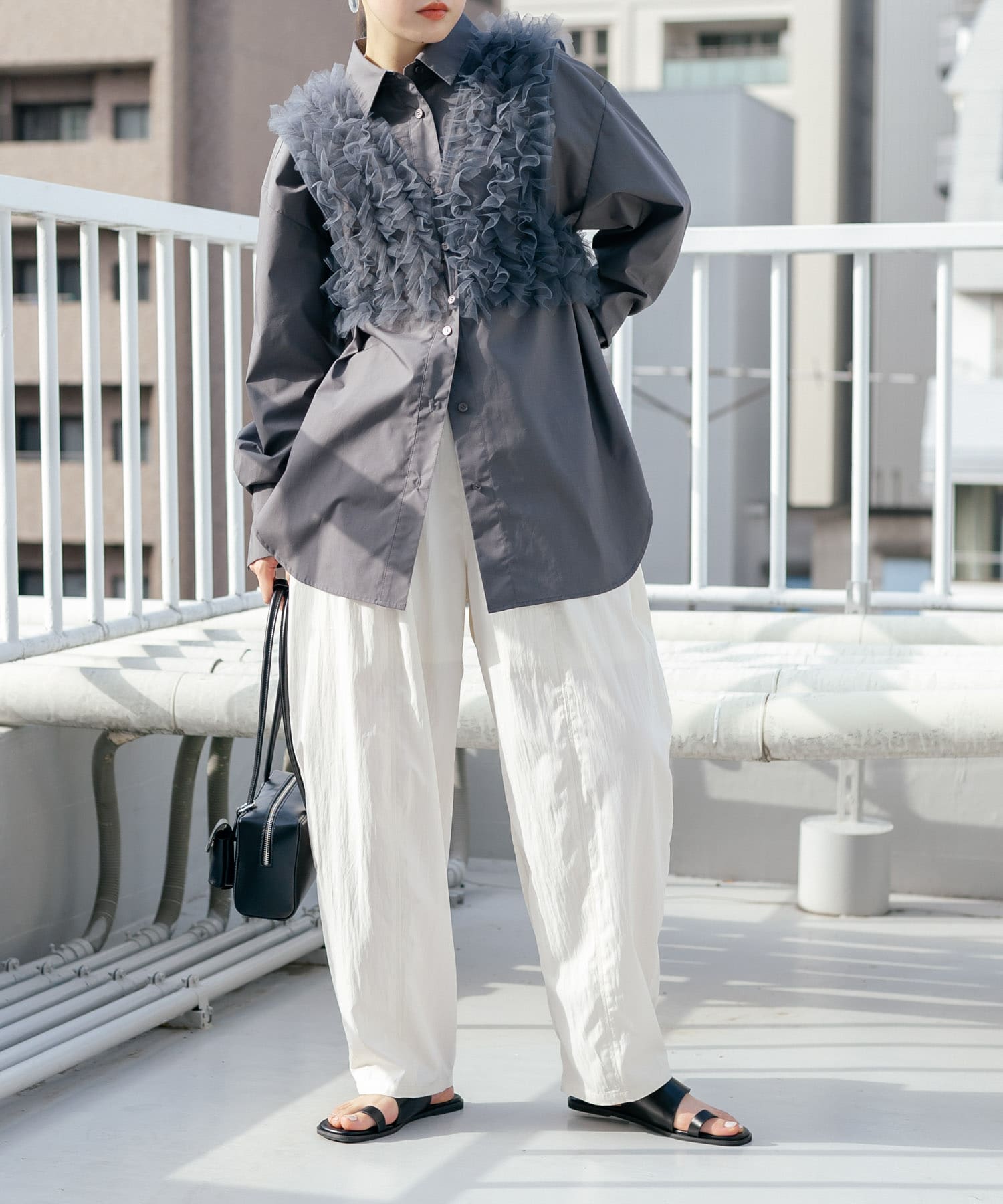 チャコールカラーのシアーフリルSETシャツに、ブラックのイージーパンツを合わせて、カジュアルモードなスタイルにしてみました。