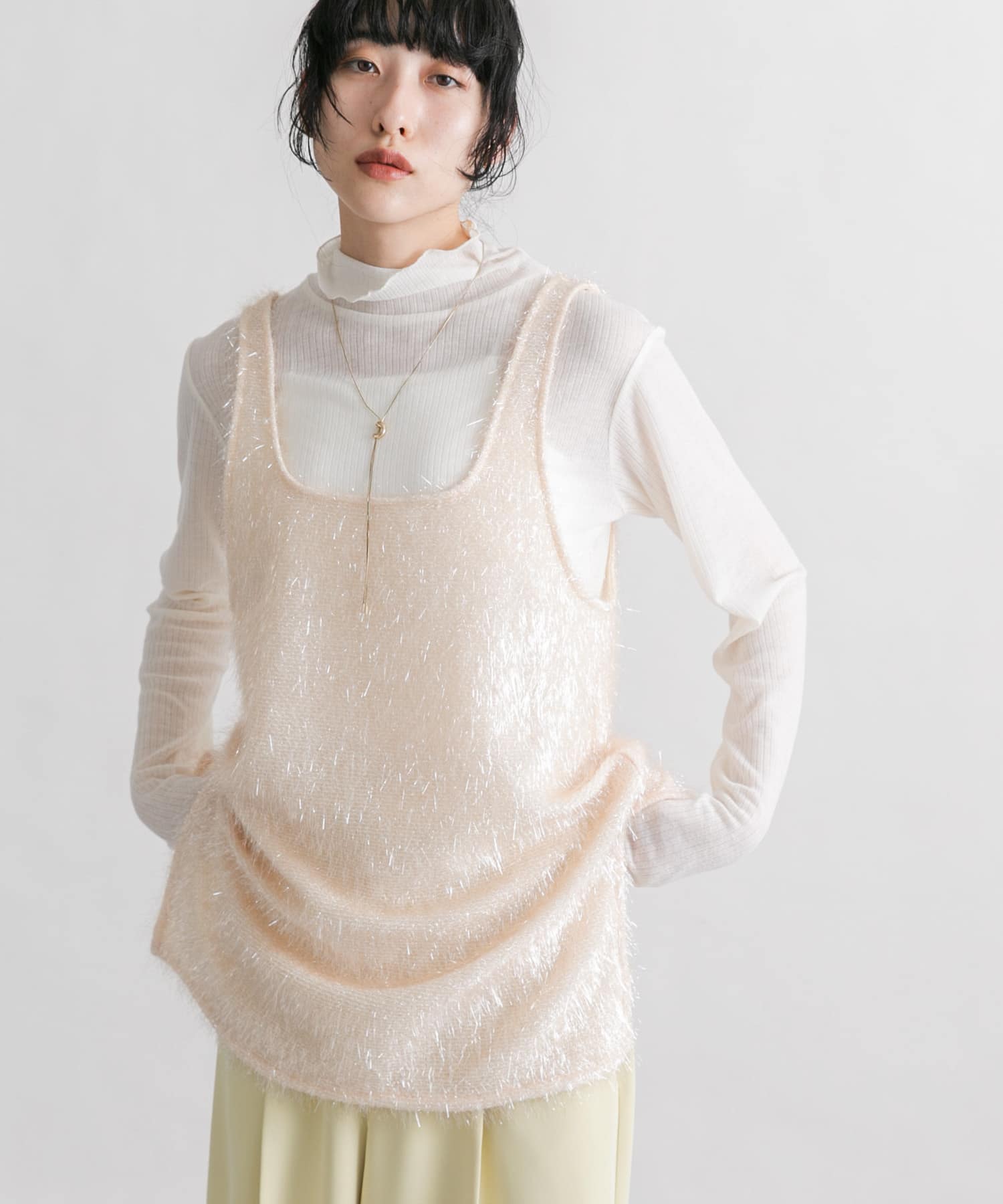 インナーとして使いやすいトップスにグリッターの映えるタンクトップを重ねて明るめな印象に✨️
