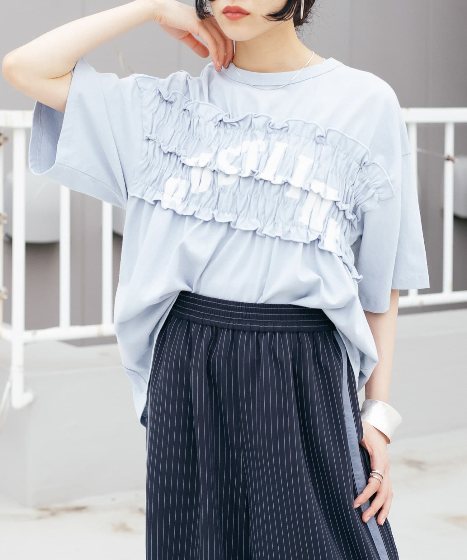 Tシャツはシャーリングデザインが可愛く、お袖も長めでカバーして着られるので◎