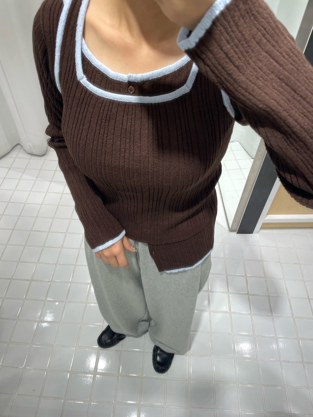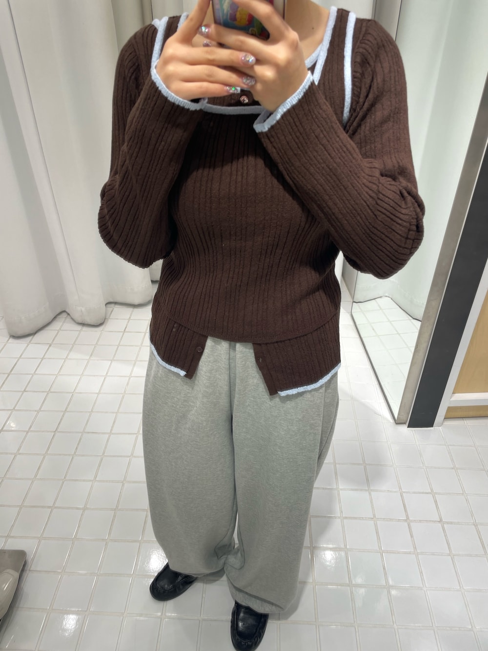バイカラーが可愛い薄手ニットにゆるっとスウェットパンツを合わせました✨