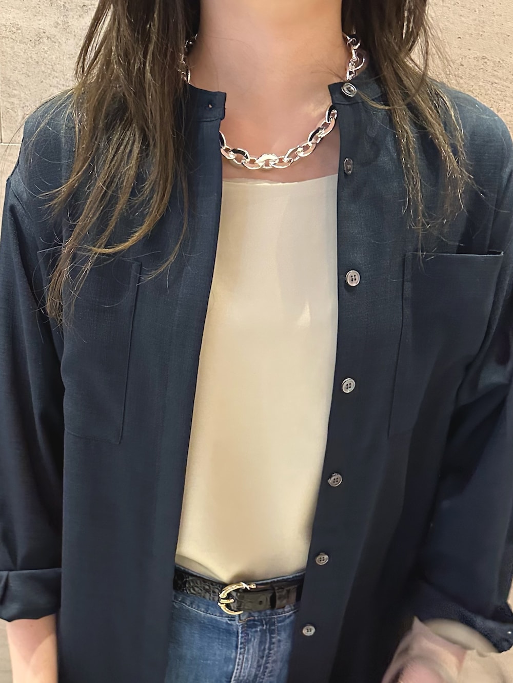 定番のデニム合わせもインナーをサテンキャミにして抜け感とゴツメのアクセでおしゃれ感をUP⤴️