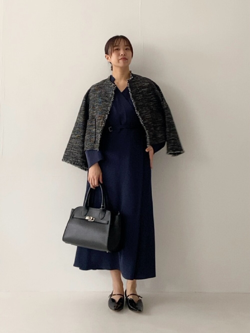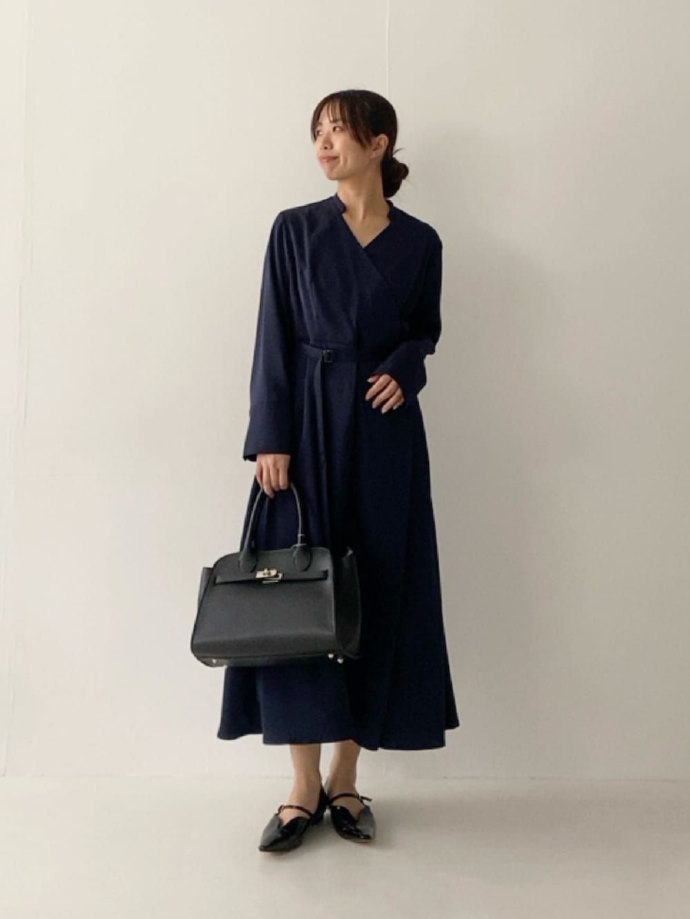 ツヤのあるネイビーが知的な印象を高めてくれるワンピース。