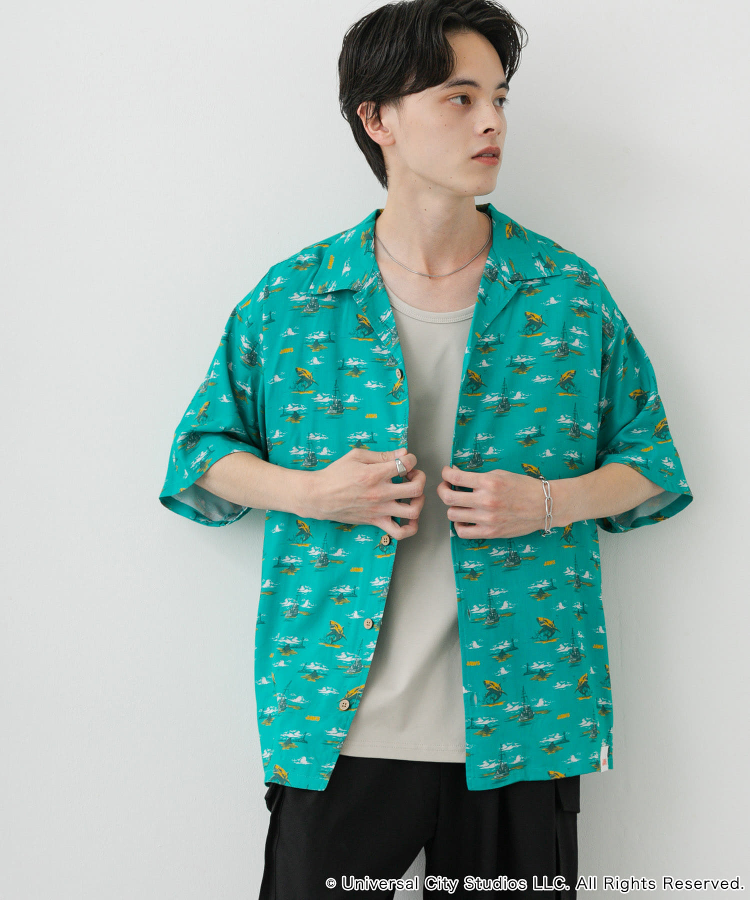 『別注』JAWS×SENSE OF PLACE 総柄オープンカラーシャツ