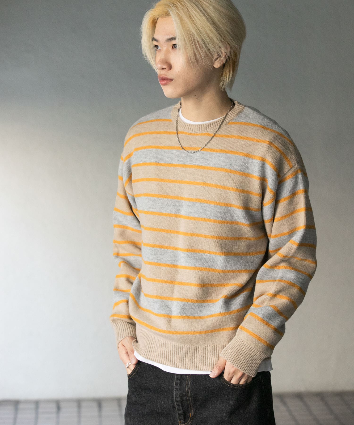 ウールブレンドボーダークルーネックニット