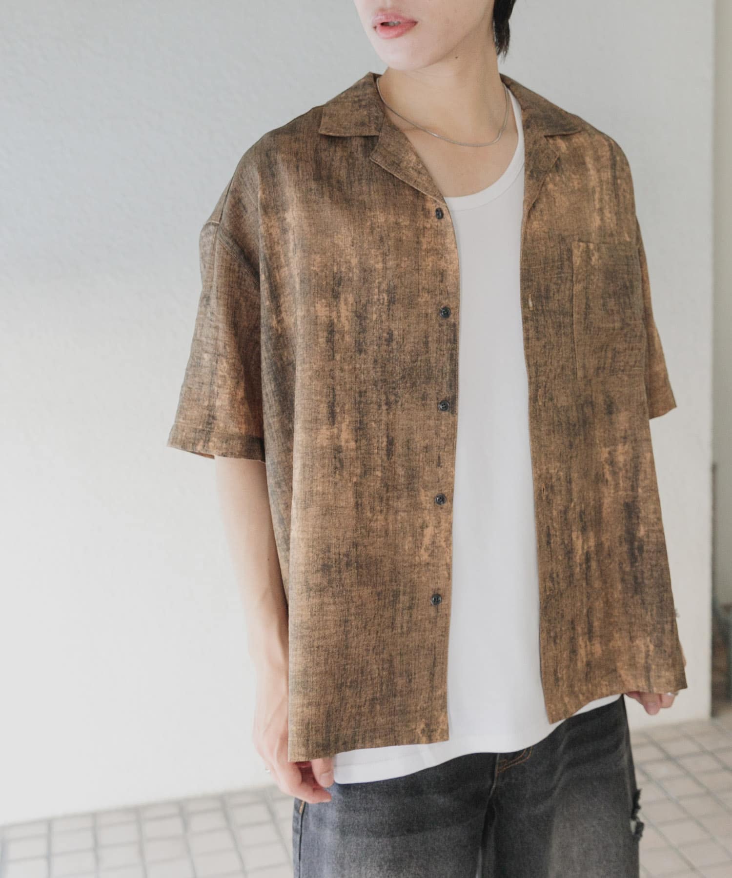 味のある柄シャツにダメージデニムを合わせて雰囲気あるカジュアルコーデとなっております◎