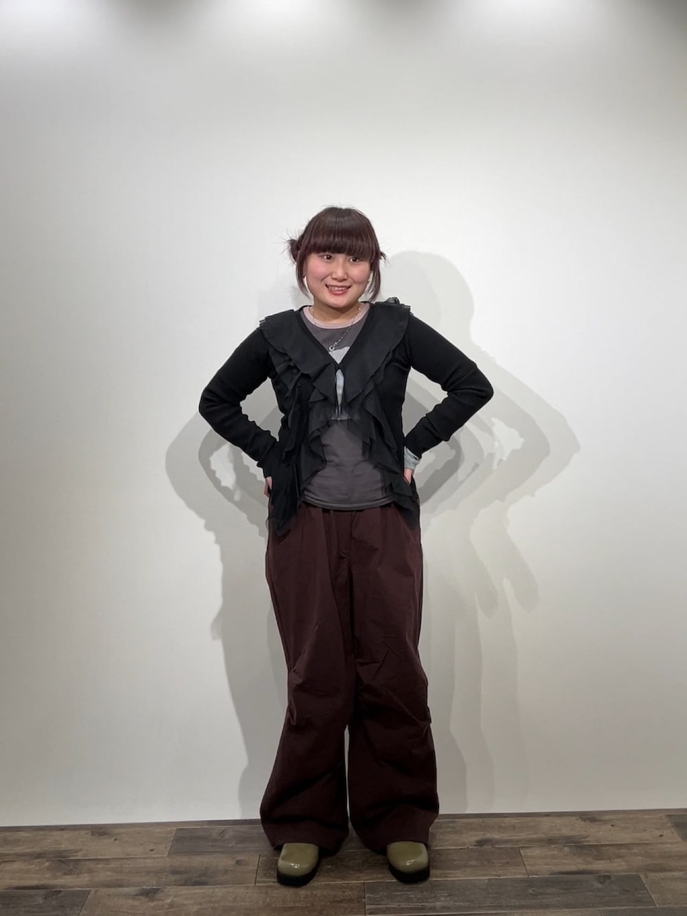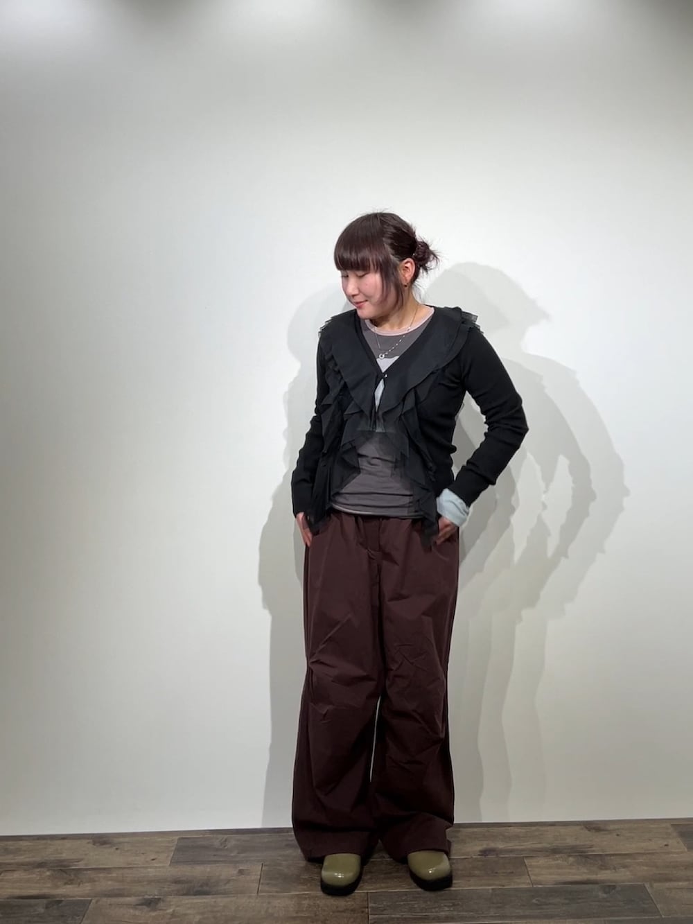フリルのカーディガンと全く違う雰囲気のカーゴパンツを合わせることで、キレイめでありながらもカジュアルな印象を持たせるコーディネートを組んでみました😖😖