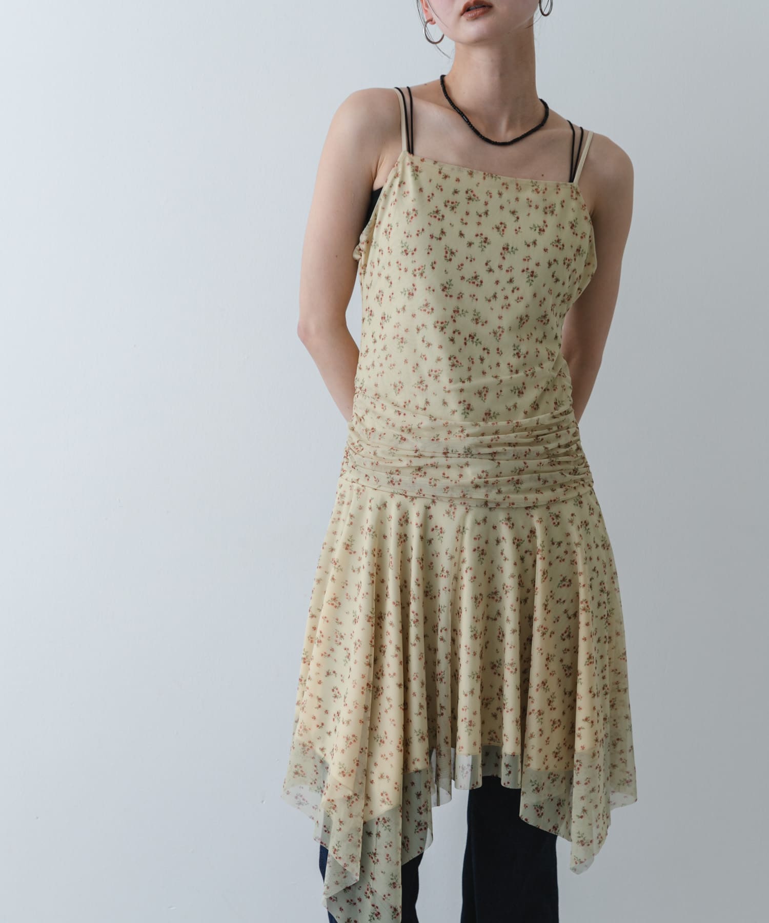 今回はレイヤードを軽やかにレトロな小花柄が映えるチュールキャミソールを着てみました