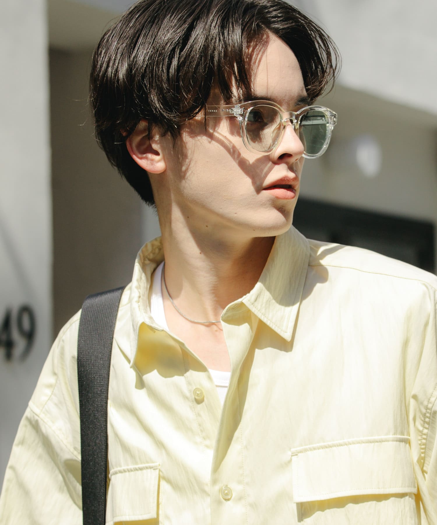 インナーのタンクトップとデニムのブルーで色を合わせ、黒のショルダーバッグで全体を引き締めました。