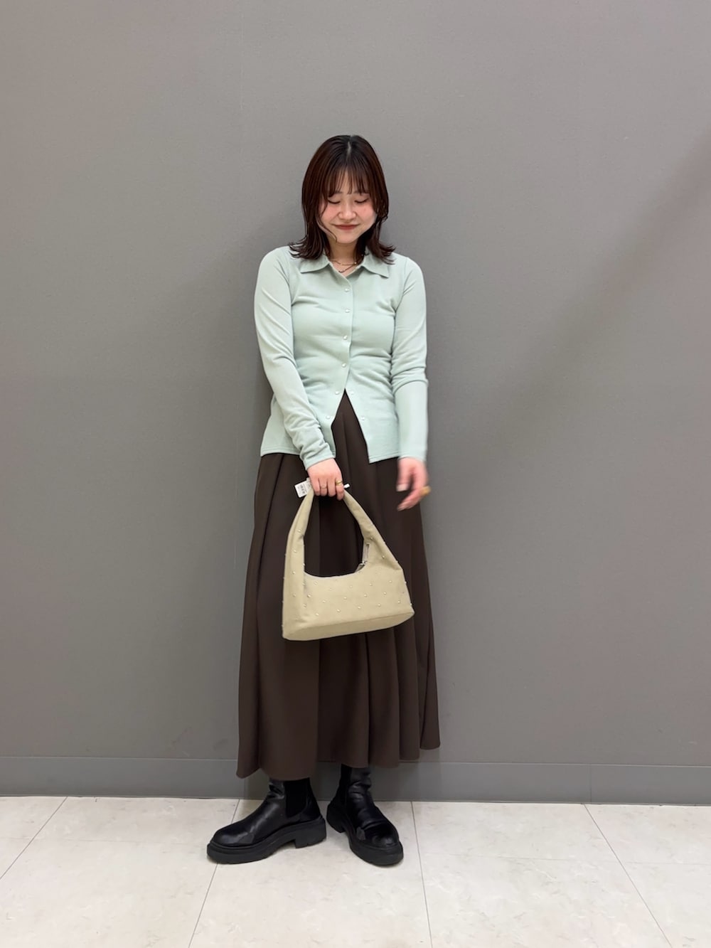リアルバイなプリーツスカートに春らしいパステルミントカラーのトップスを合わせて、清楚な雰囲気のスタイリングに。