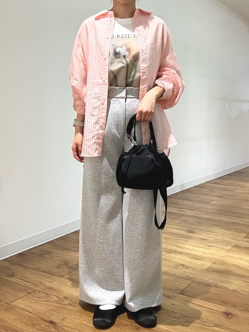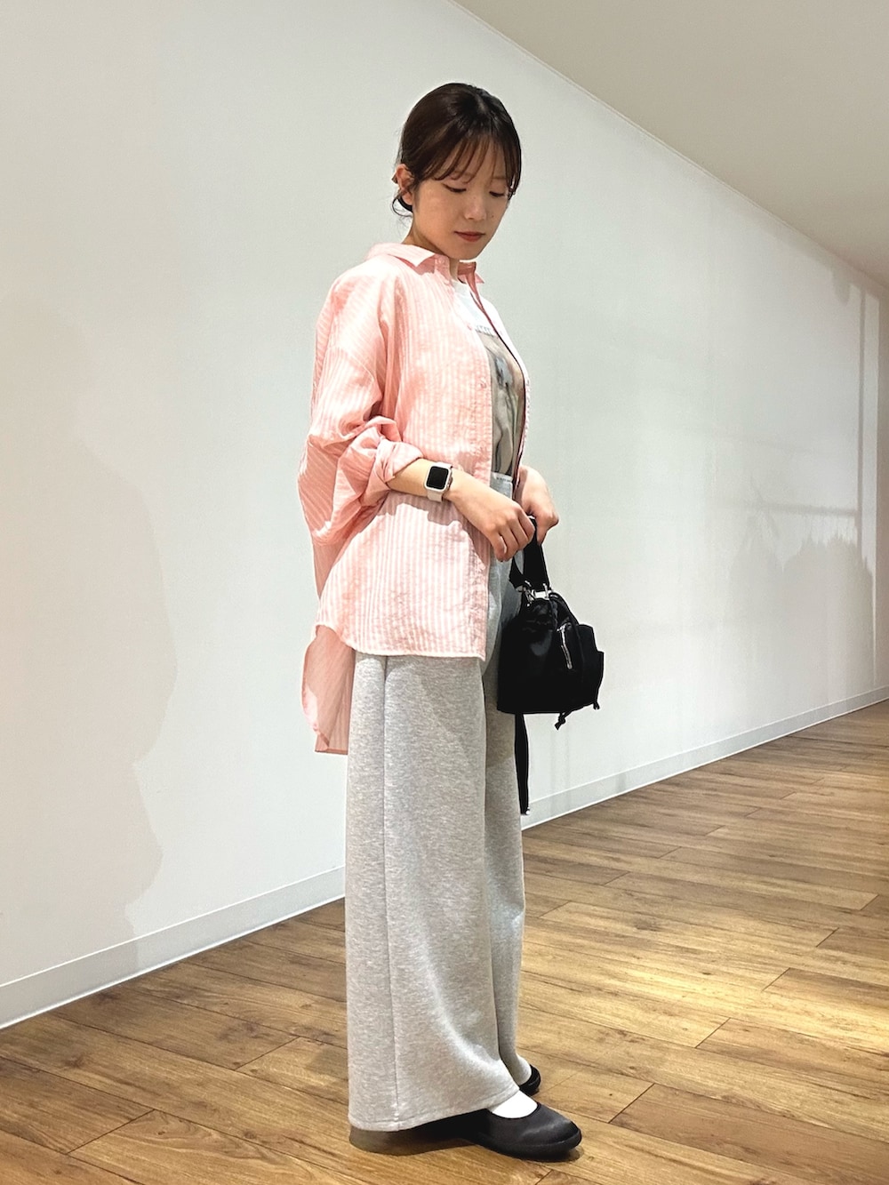 スウェットスラックスもきれいなワイドシルエットで、とにかく楽ちん!