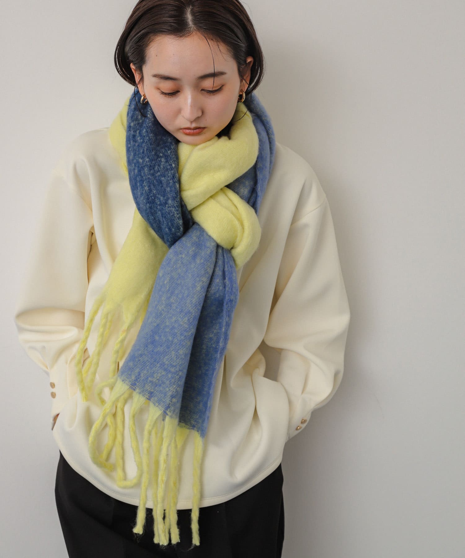 差し色マフラー合わせで明るい印象に!⭐️