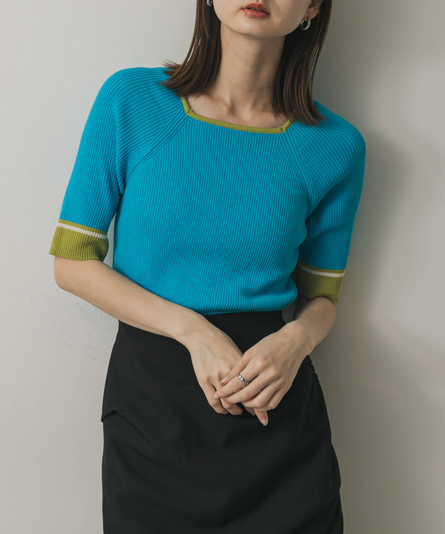 涼しげなターコイズブルーのトップスはスクエアネックになっており、デコルテをスッキリと見せてくれます。