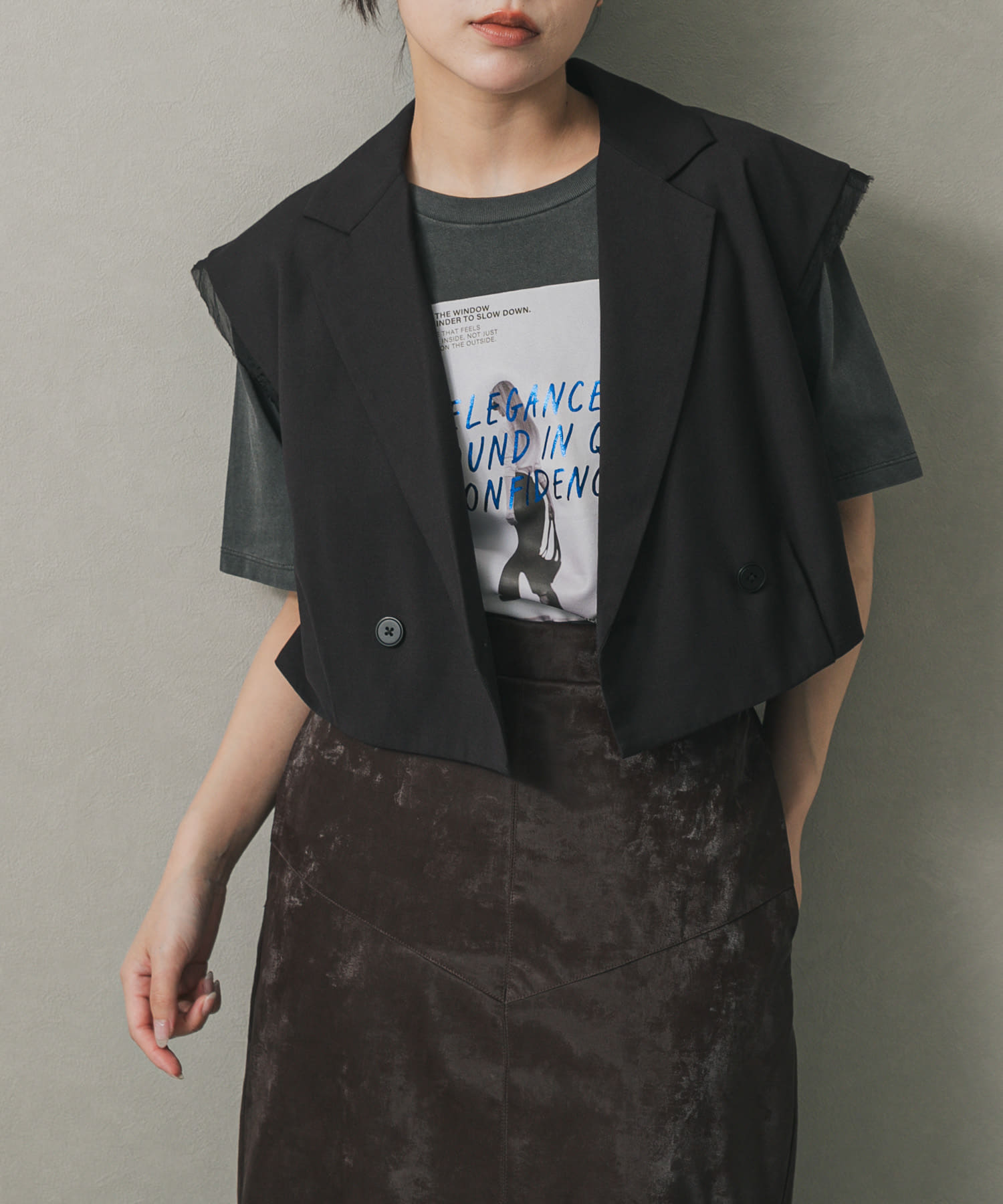 短い丈のジレなので、インナー出して見せるスタイルも楽しめます◯