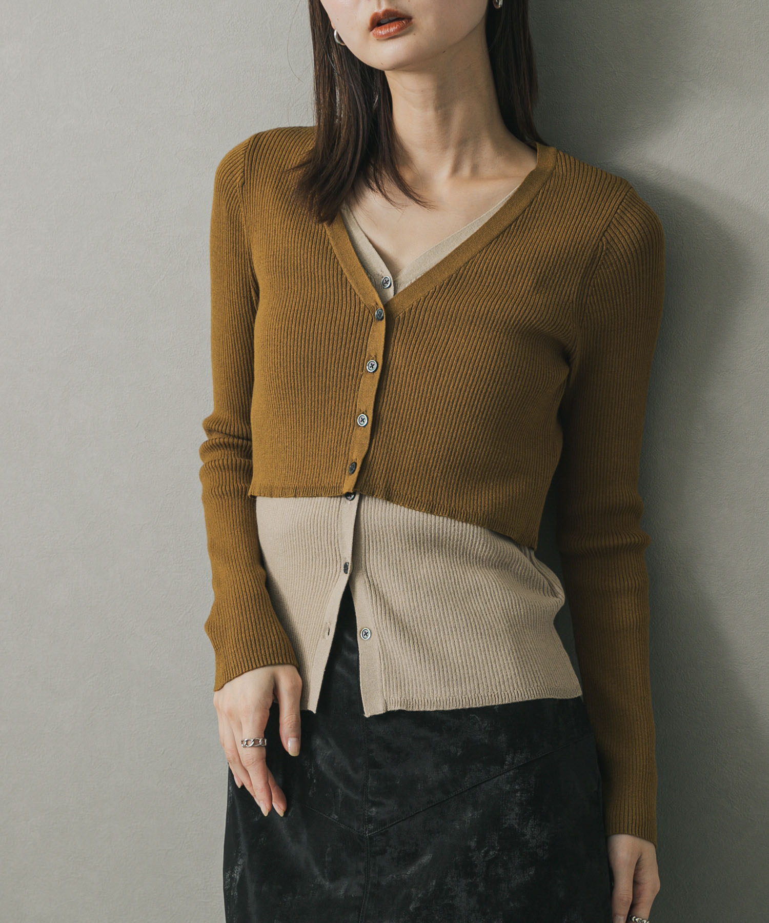 インナーに着ているカーディガンは一枚着るだけでレイヤードしてるかのようなデザインでおしゃれになります♩