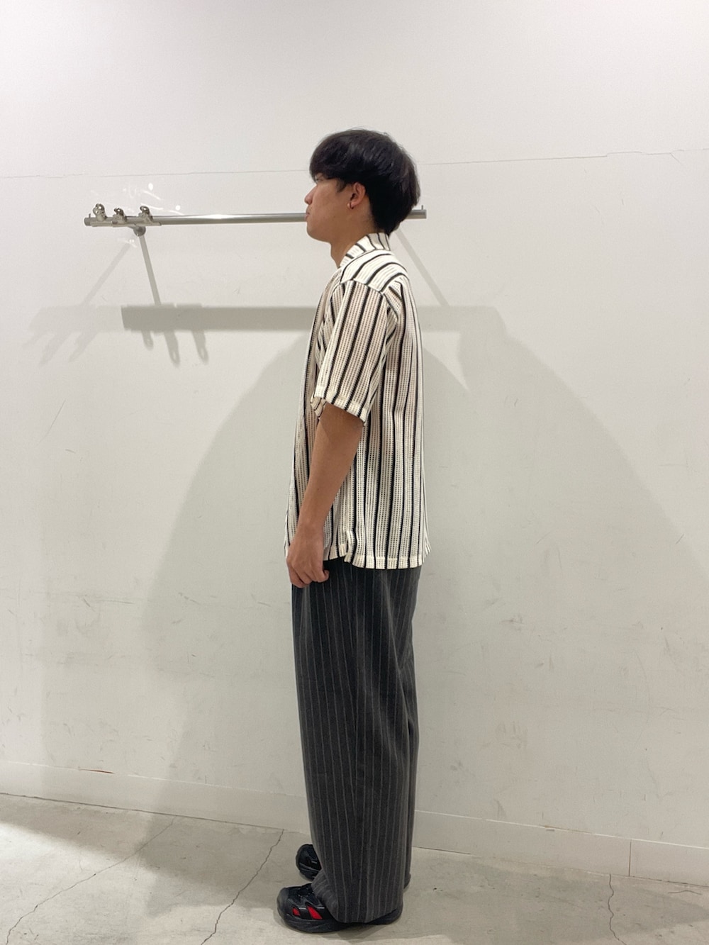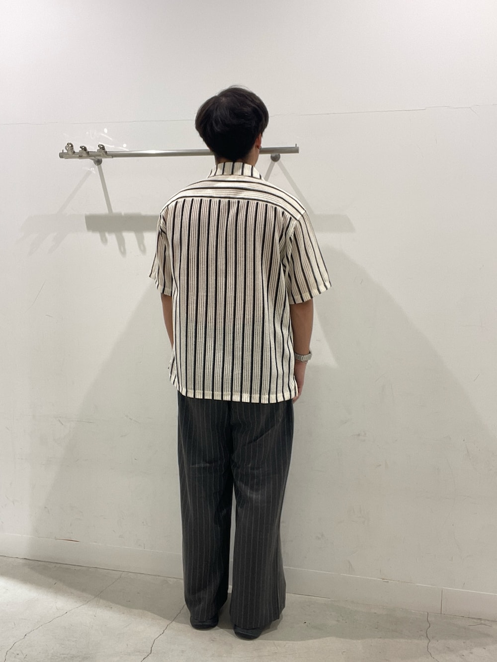 白のシアーシャツにグレーのストライプパンツで統一感を意識。
