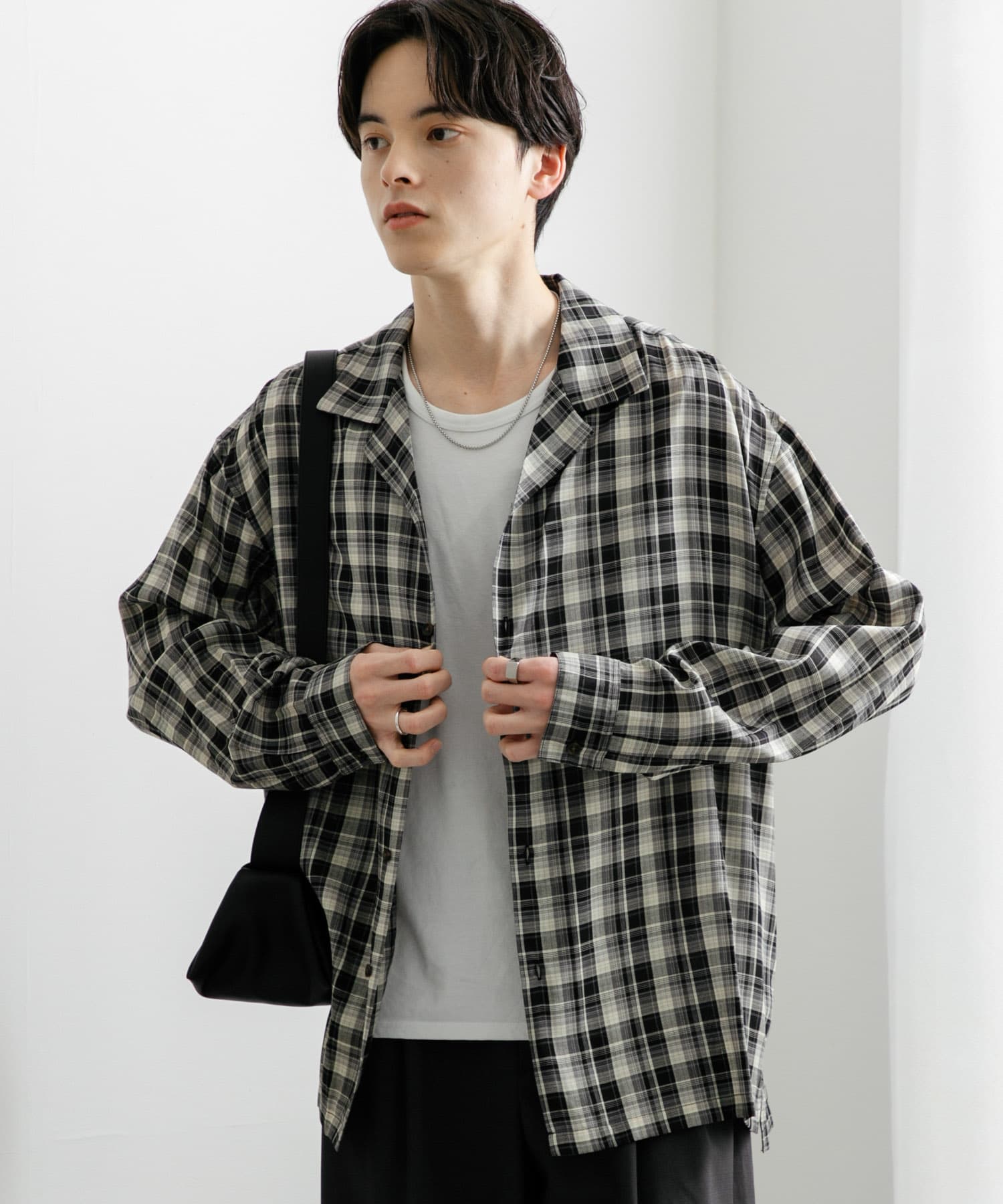 SENSE OF PLACE『ユニセックス』シアーチェックオープンカラーロングスリーブシャツ- 着用カラー: