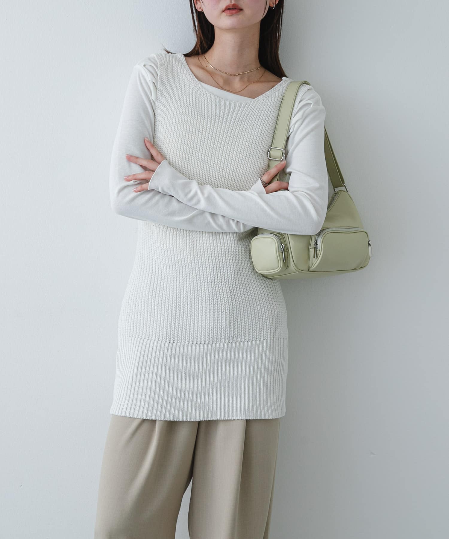 中に着ているシャツは1枚でも着ていただけるのですが、コンパクトめの作りなので、今回のようにベストやキャミワンピース等と組み合わせるのもとっても可愛いくて、相性抜群です!