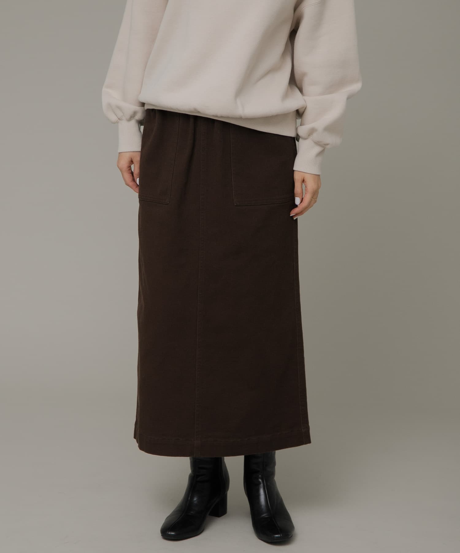 ブラウンのカーゴスカートも裏が起毛していて、とても暖かくお召し頂けます◎