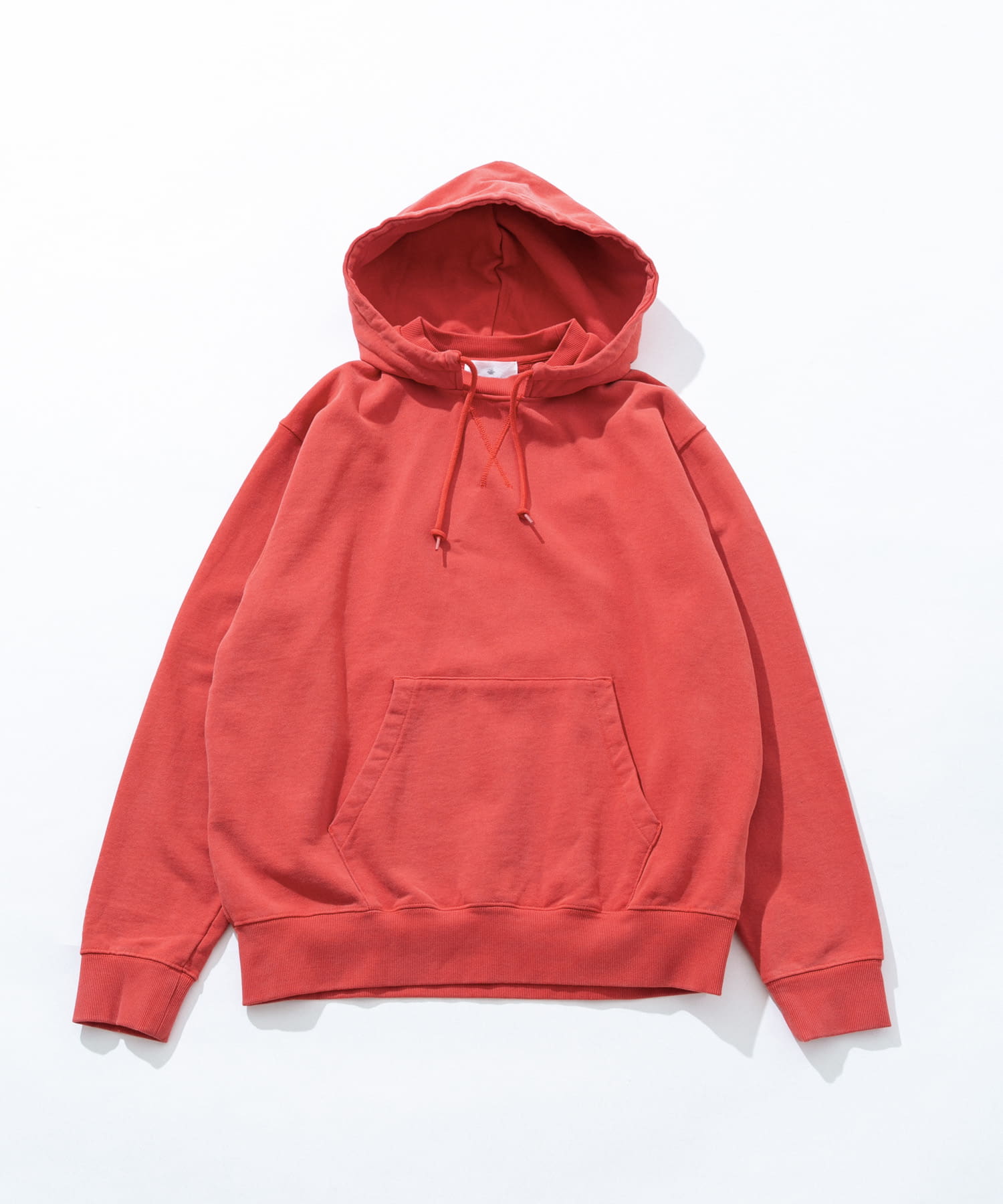 鮮やかなレッドのパーカーを主役に、ボトムとシューズをブラックでまとめた鉄板ストリートスタイル。