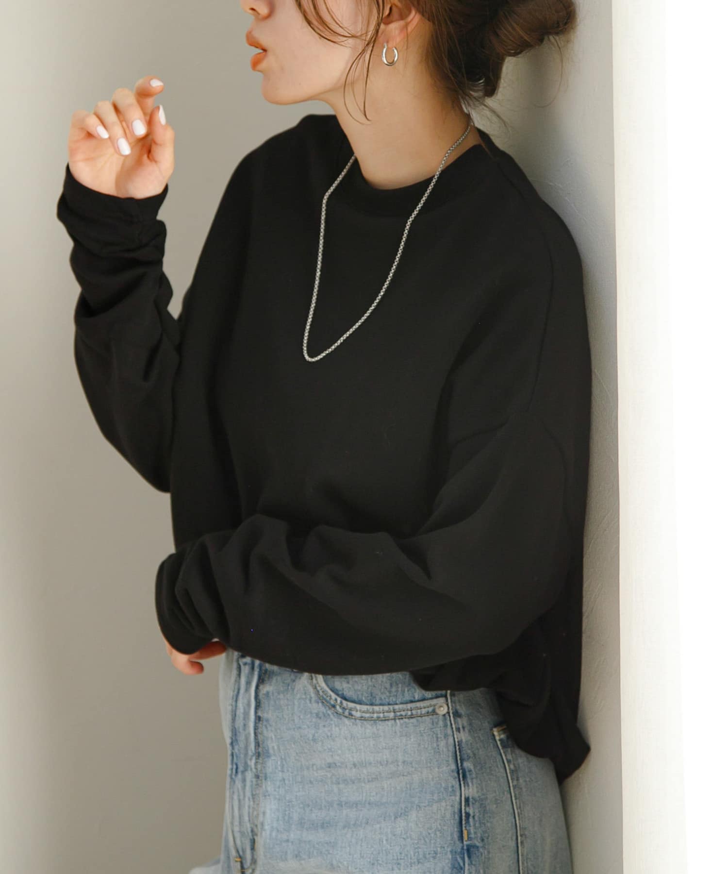 バルーンシルエットのスウェットトップス。形にデザイン性があるので、シンプルなコーディネートでもオシャレに決まります。