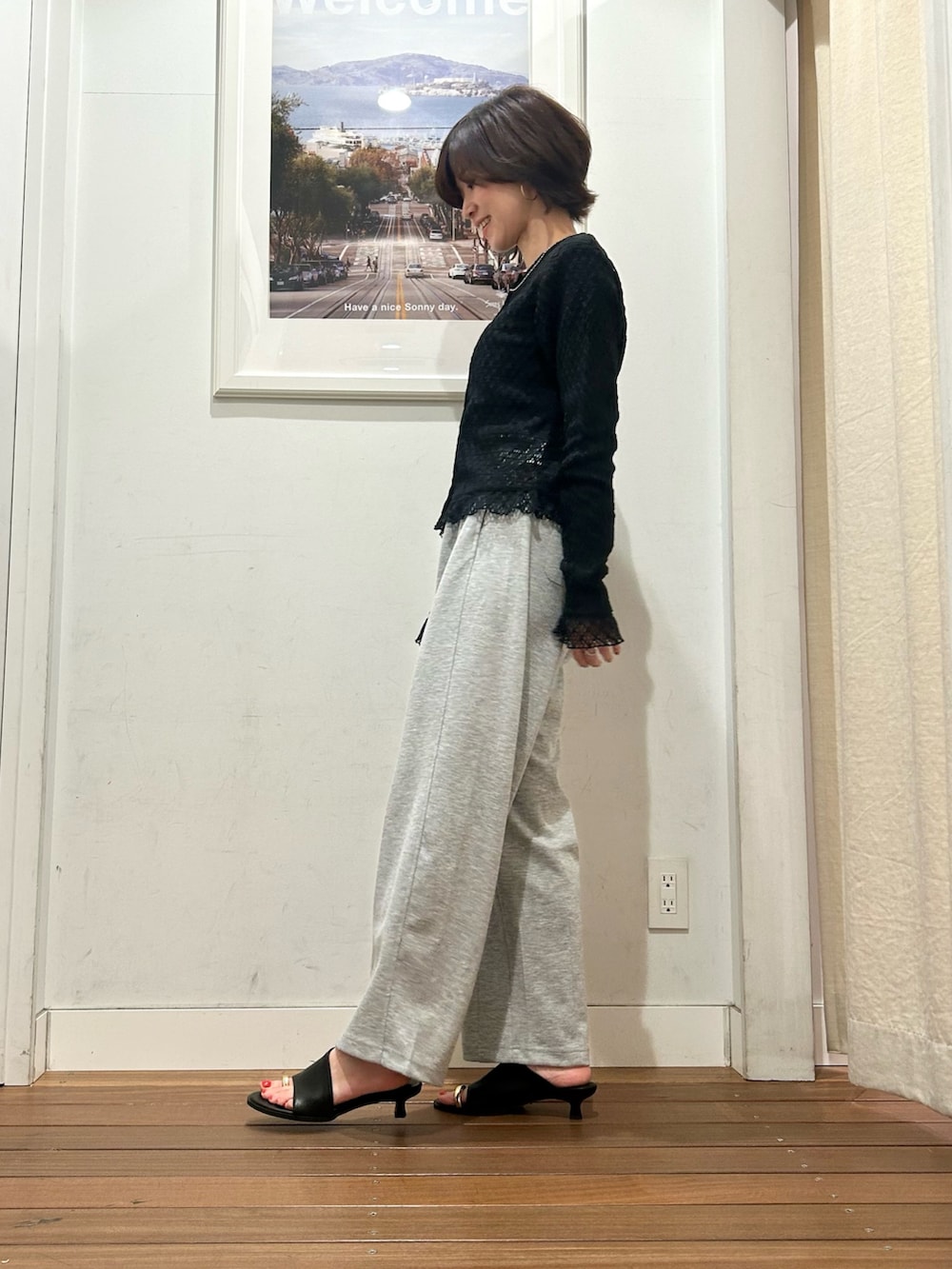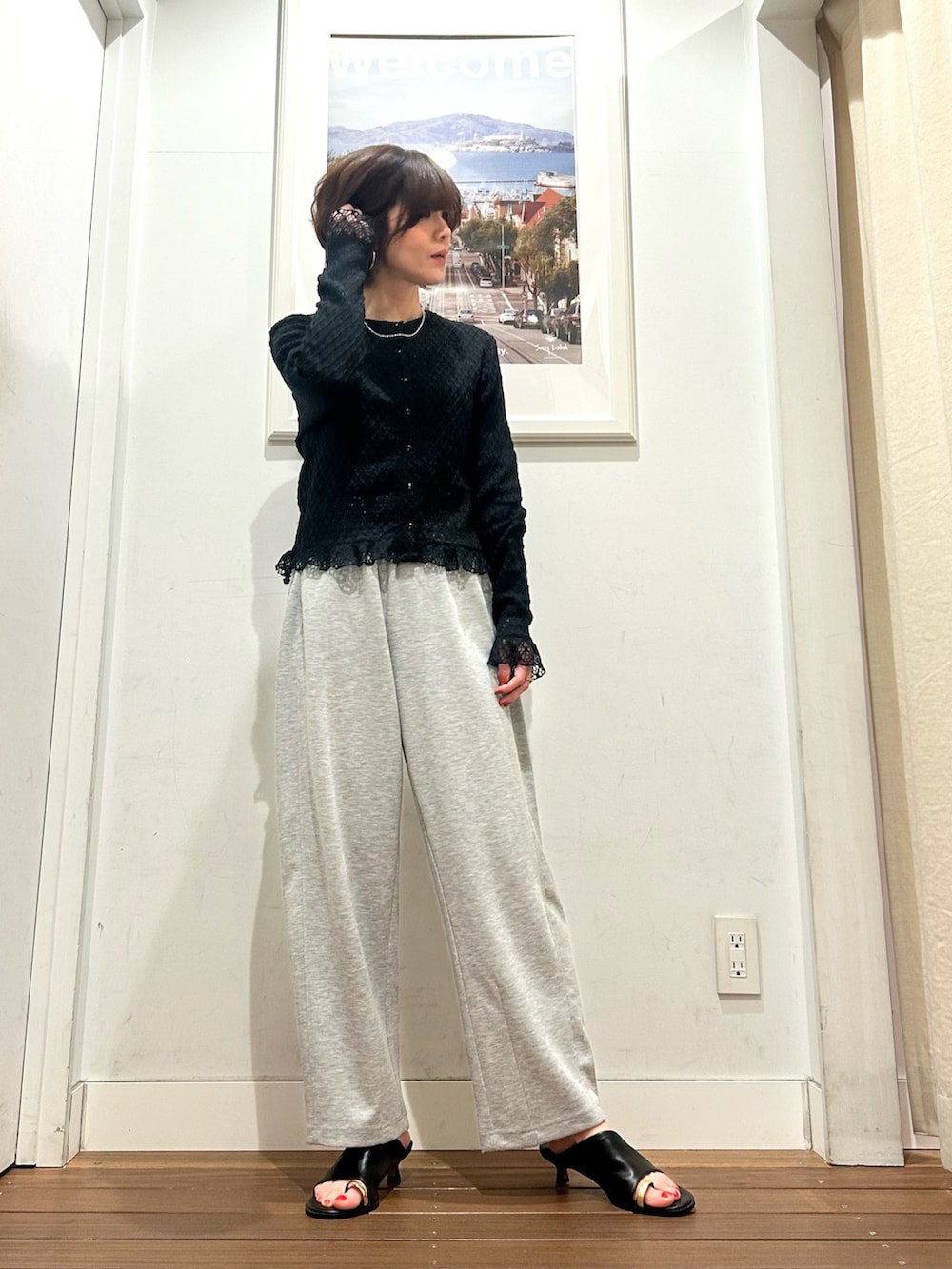 少しヒールのあるサンダルと合わせると、ラフすぎない印象になるので、スウェットパンツが部屋着っぽくなるー!とお困りの方、ぜひサンダルで合わせてみてくださいね♡