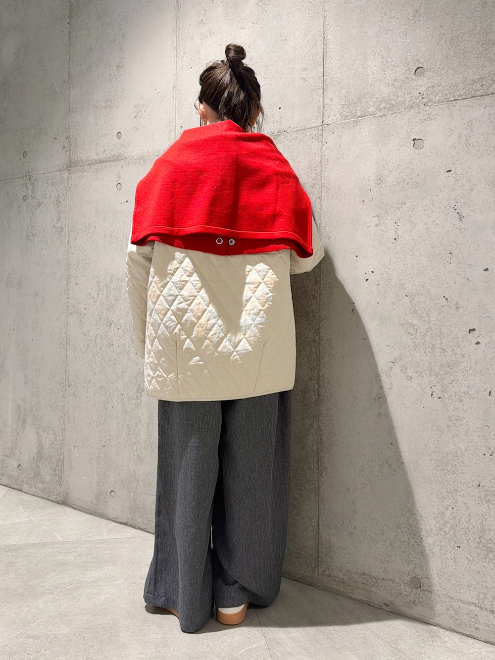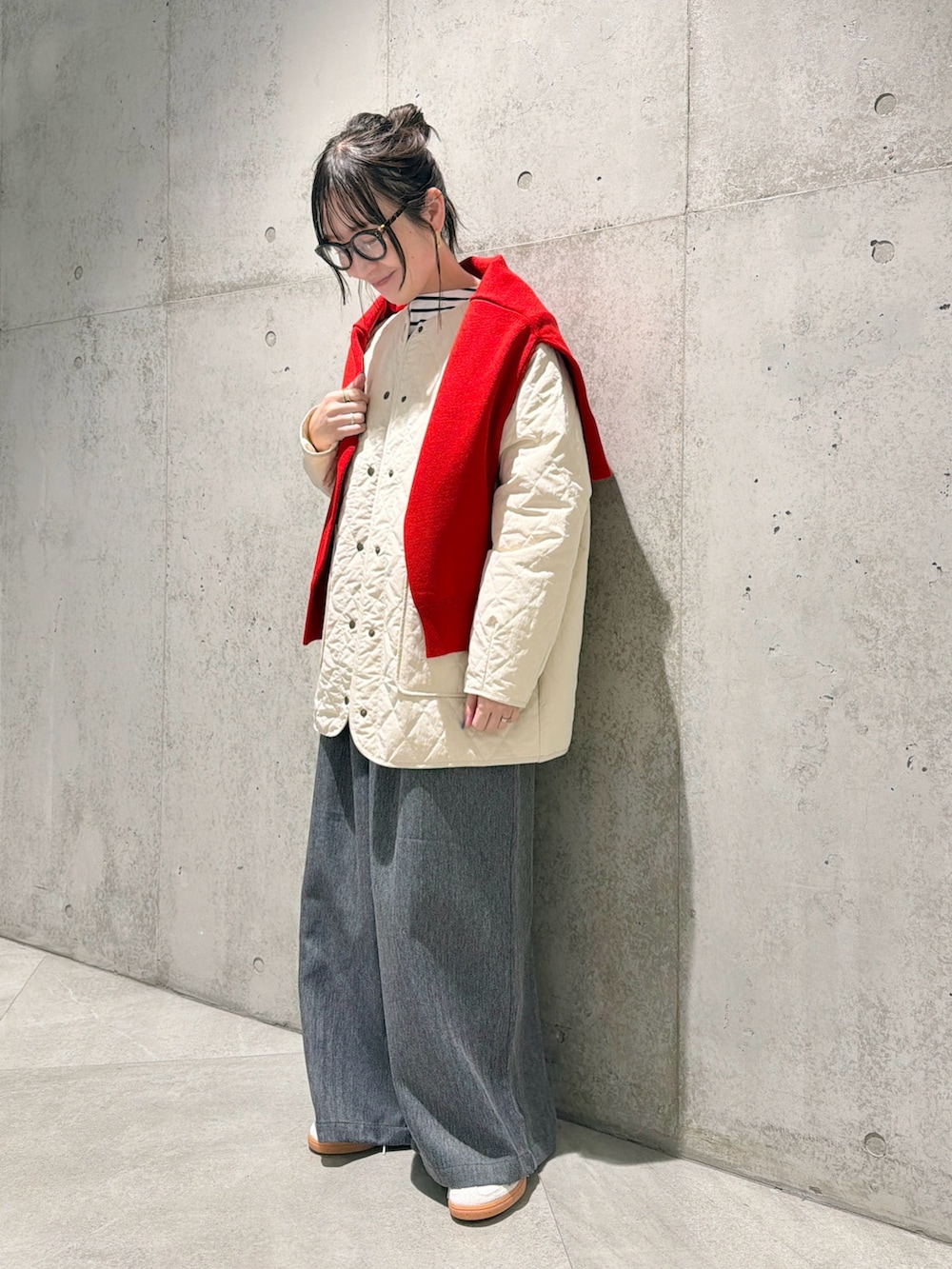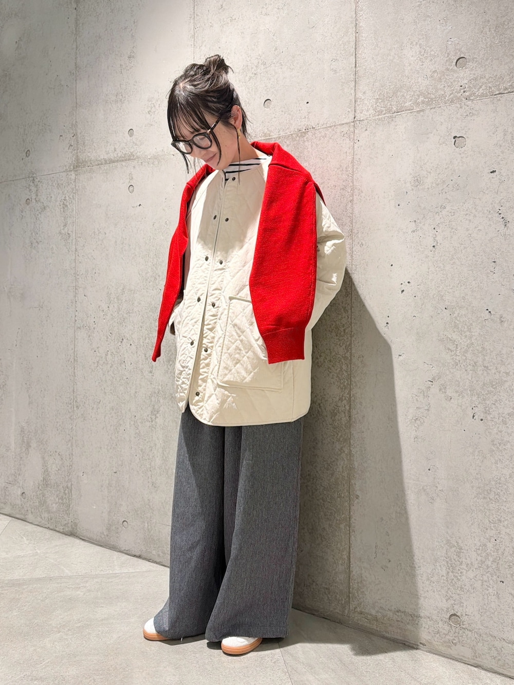 赤いカーディガンを肩掛けにして、トレンドライクなスタイルに。