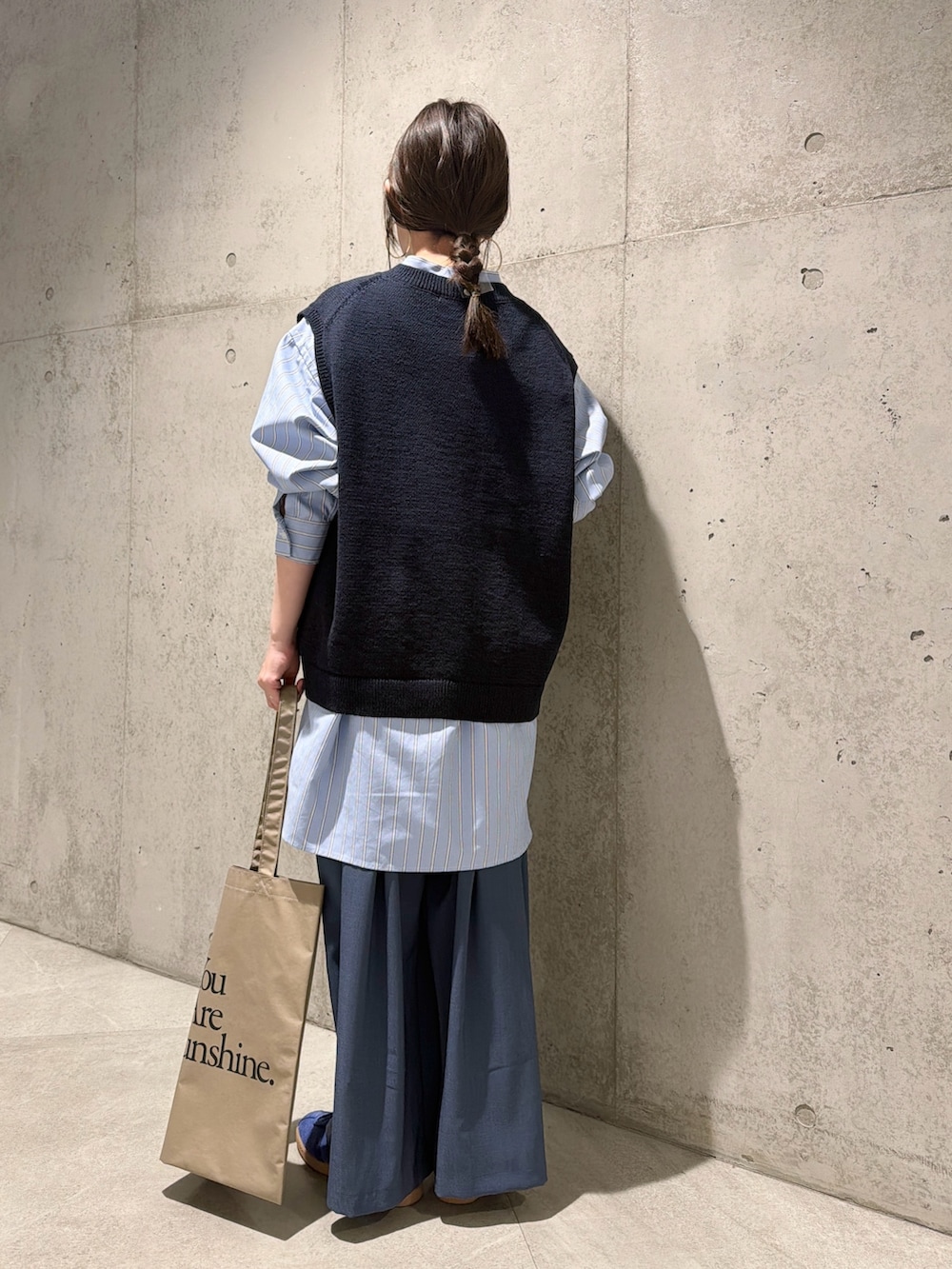 伸縮性があるので着心地や着脱も楽にでき、シャツやTシャツの上に重ねるのはもちろん、冷え込む今の季節ならタートルネックのカットソーを合わせると即活躍します。