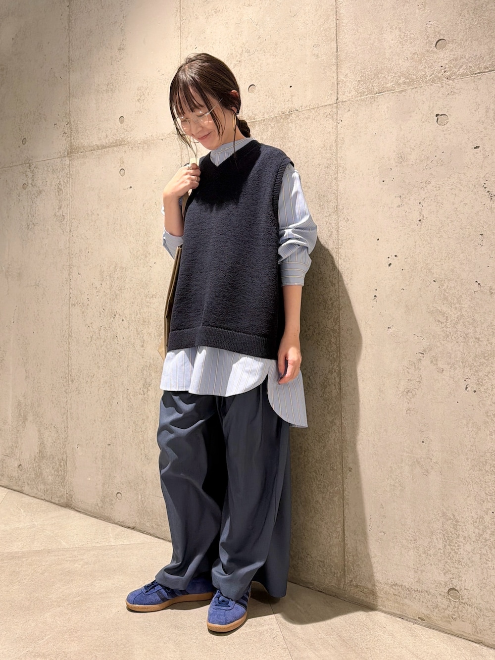 今回は、ストライプ柄のシャツを合わせて、春までお使いいただけるコーディネートです。