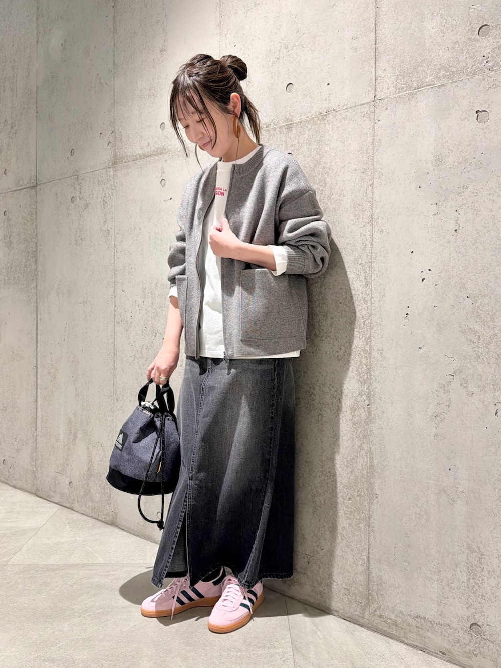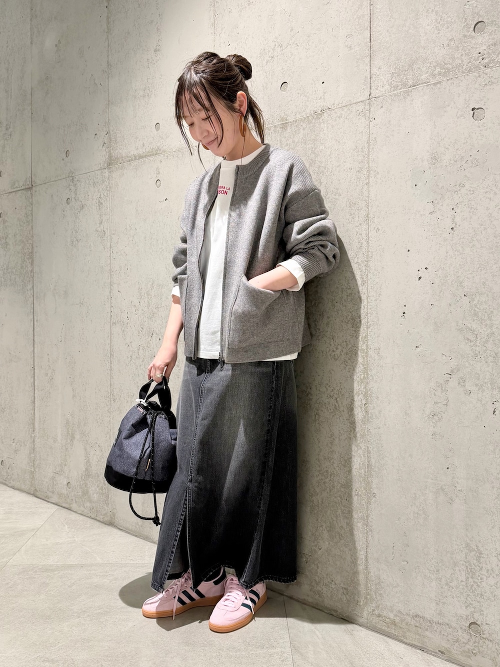 デニムのスカートは、スッキリとしたシルエットがポイントです。