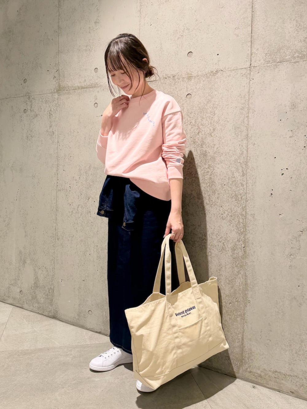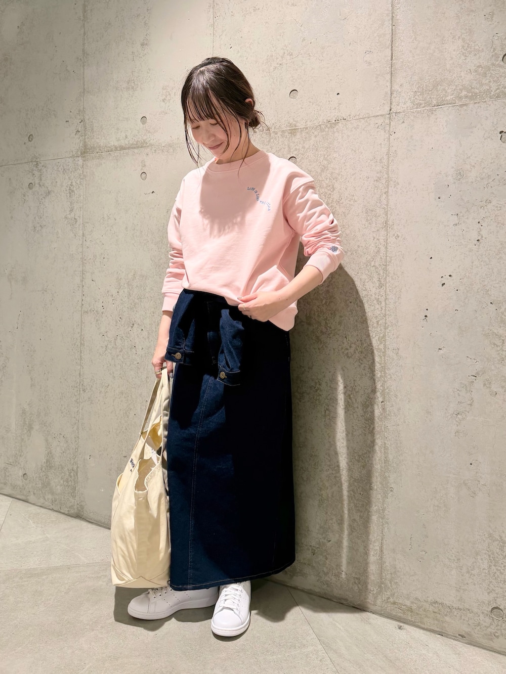 今回は、デニムのワンピースの袖を腰で縛り、ロングスカートとして穿いてみました。