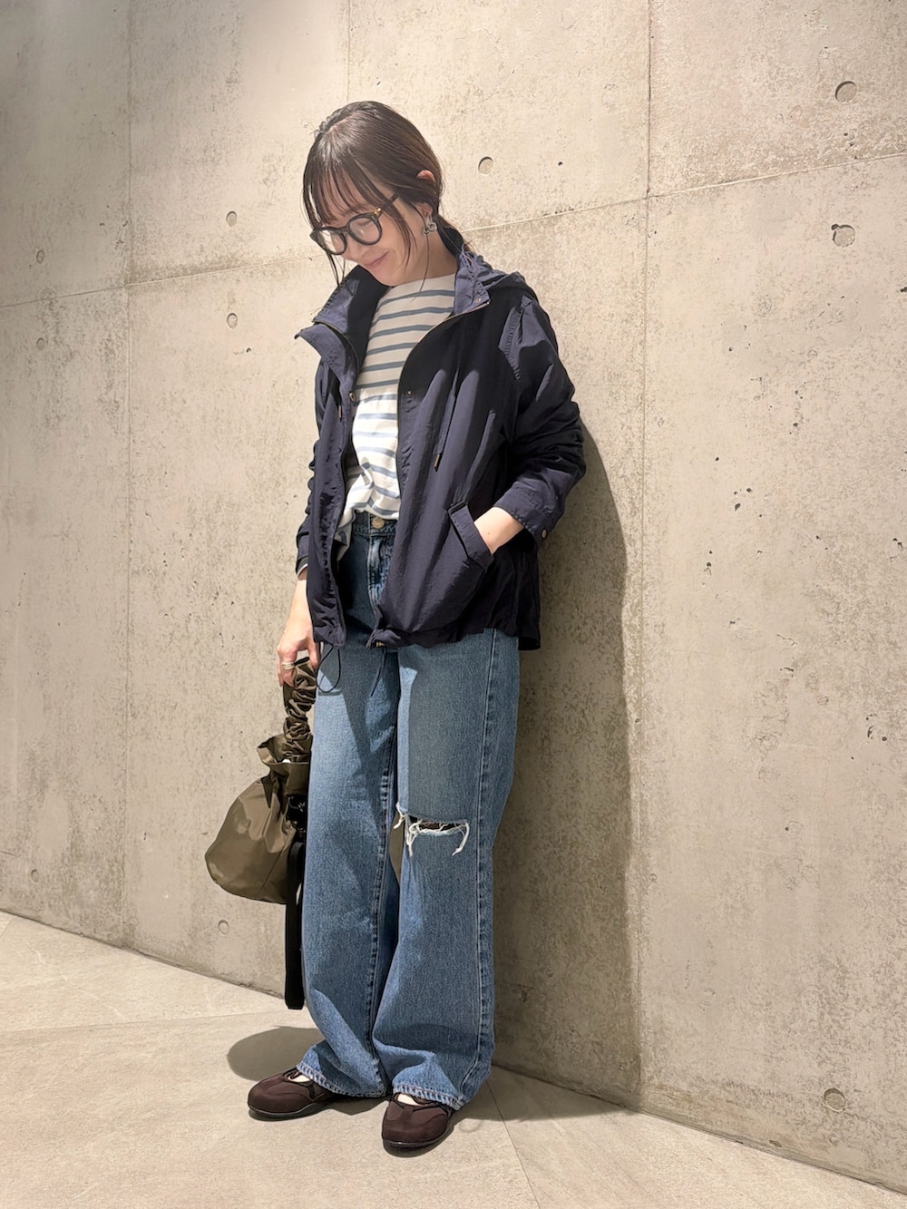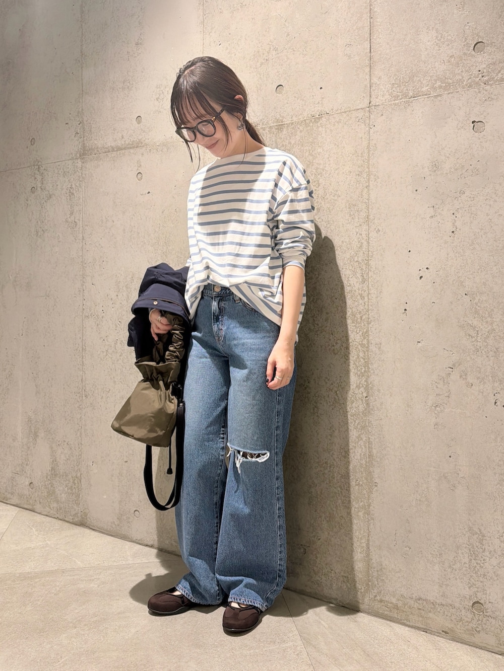 デニムは、膝にカットオフデザインがあり、こなれ感を演出します。