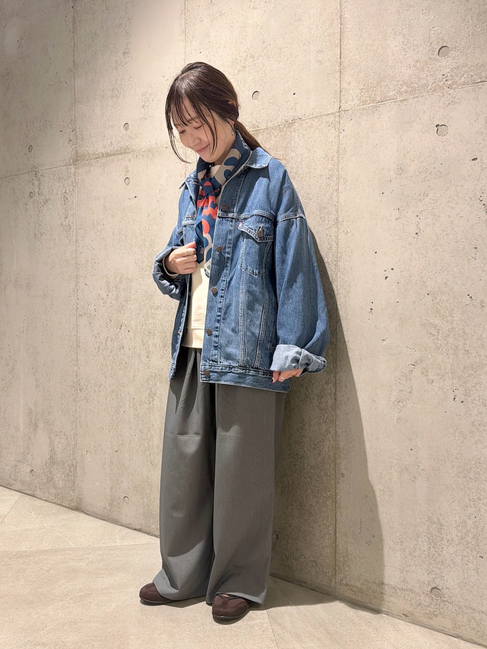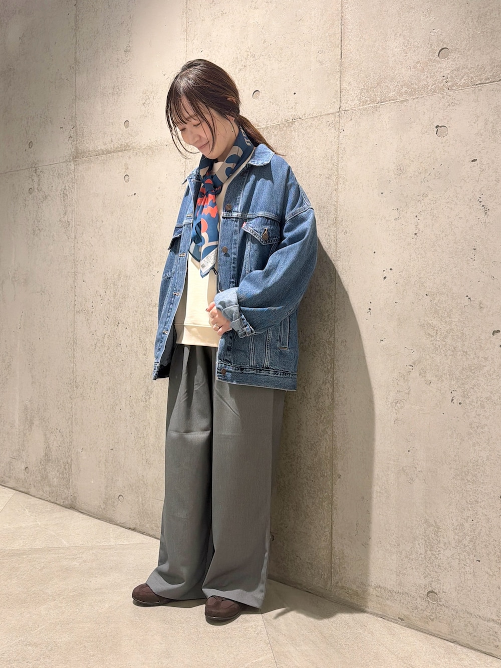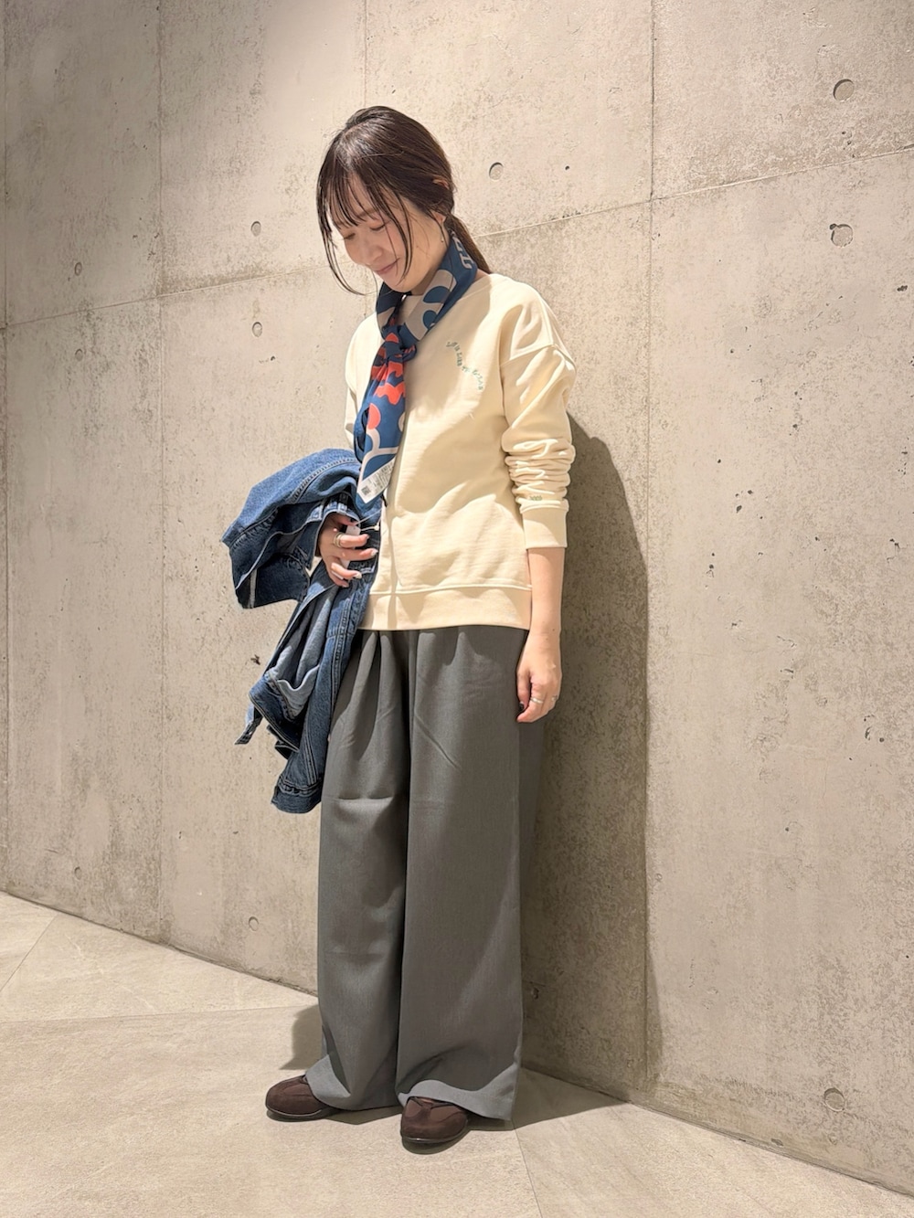 今回は、Toyamegさんとのコラボレーションスウェットに、スカーフを巻いた、大人カジュアルコーディネート。