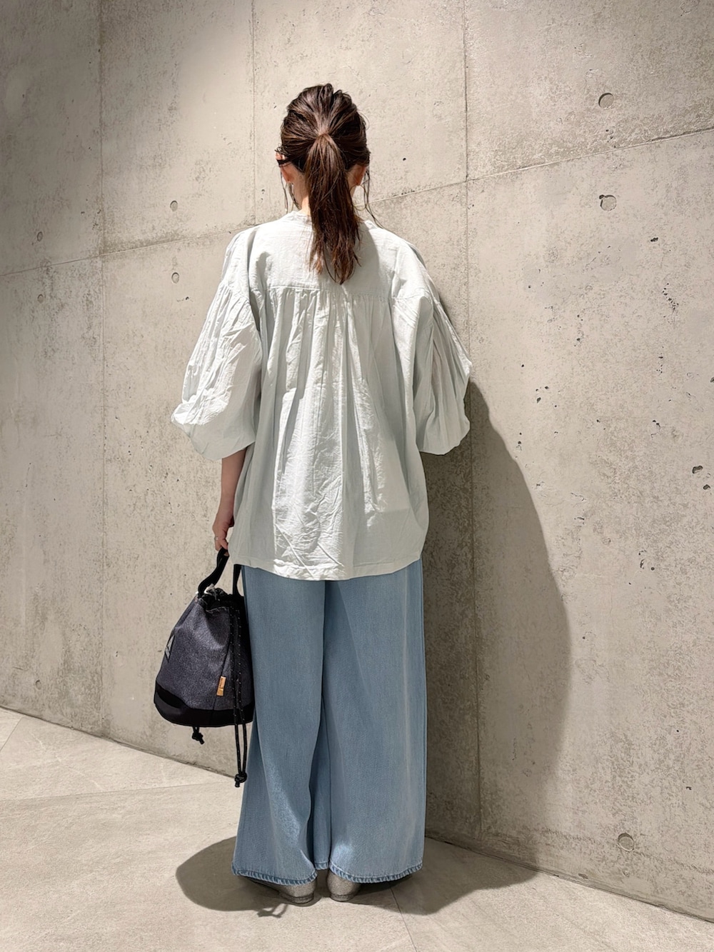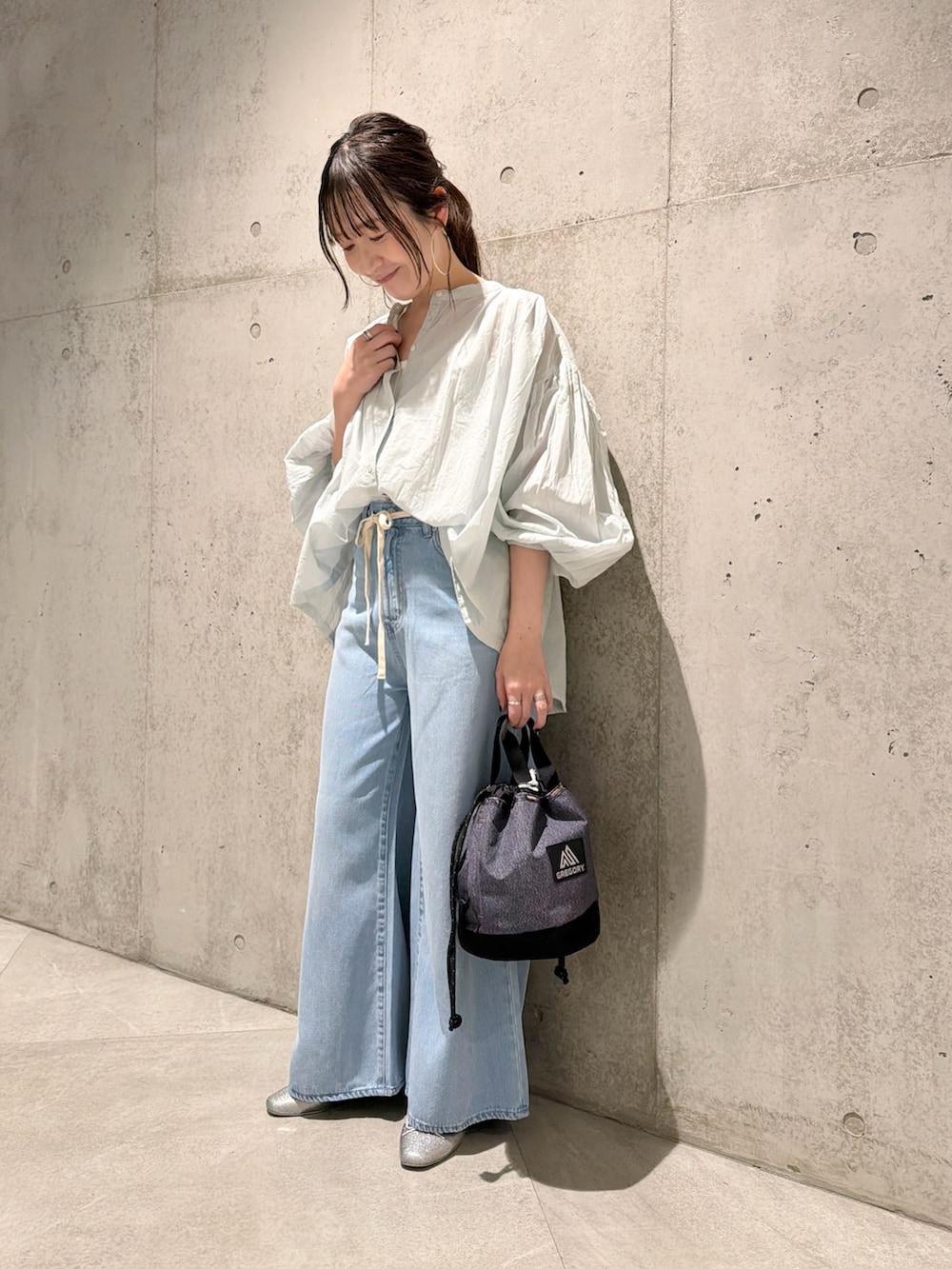 今回は、ウエストの紐がアクセントになったデニムパンツと合わせました。