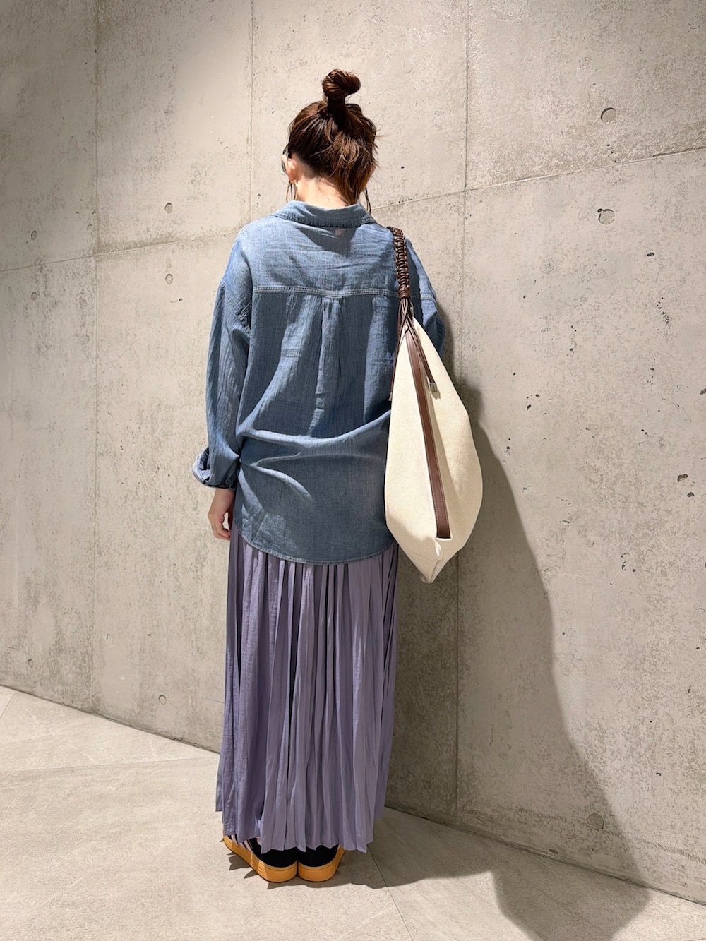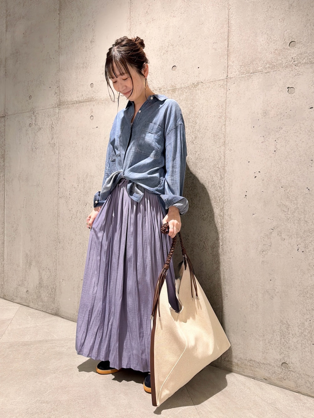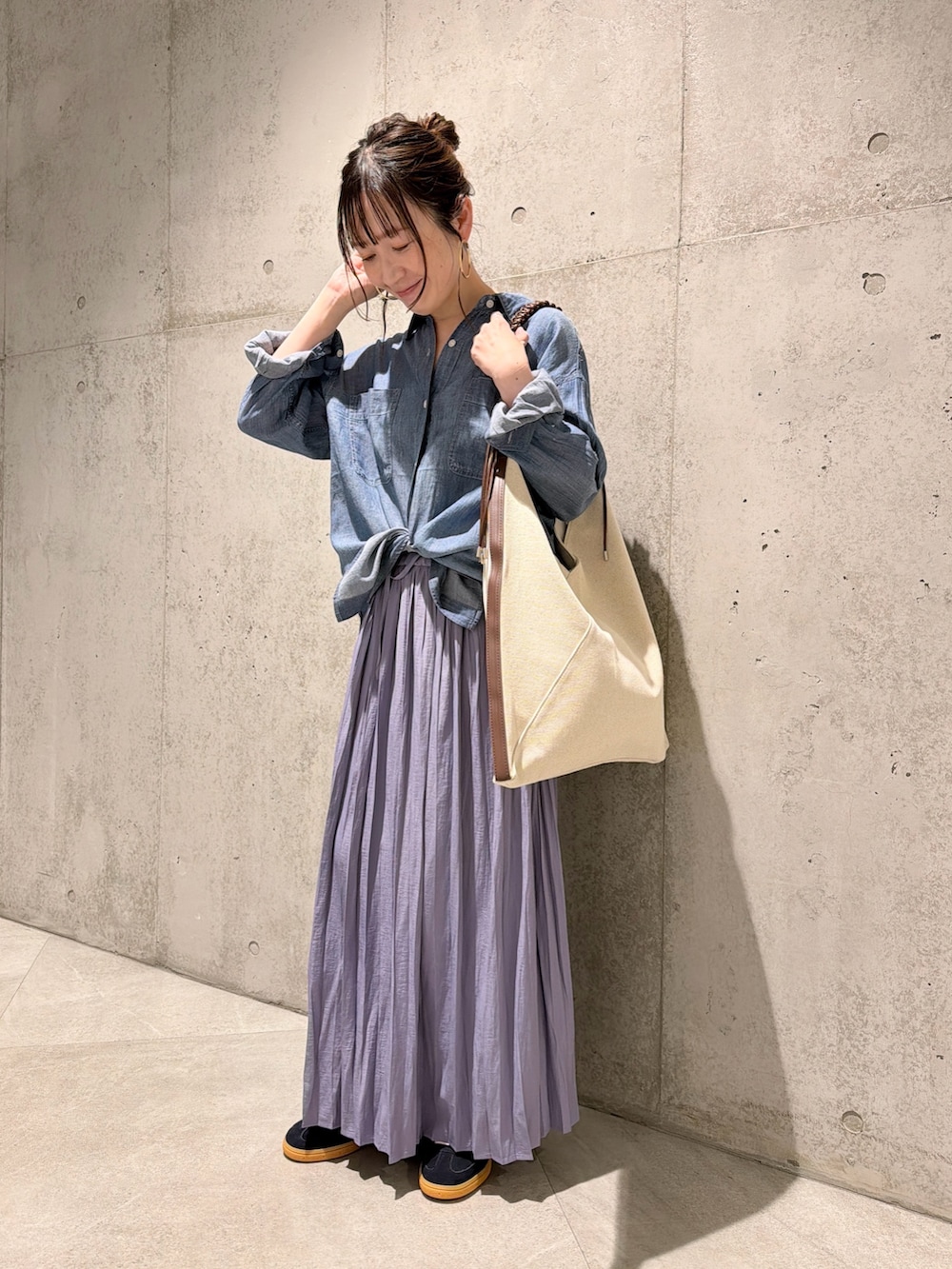 今回は、パープルが華やかな印象のプリーツスカートと合わせた、大人カジュアルコーディネートです。