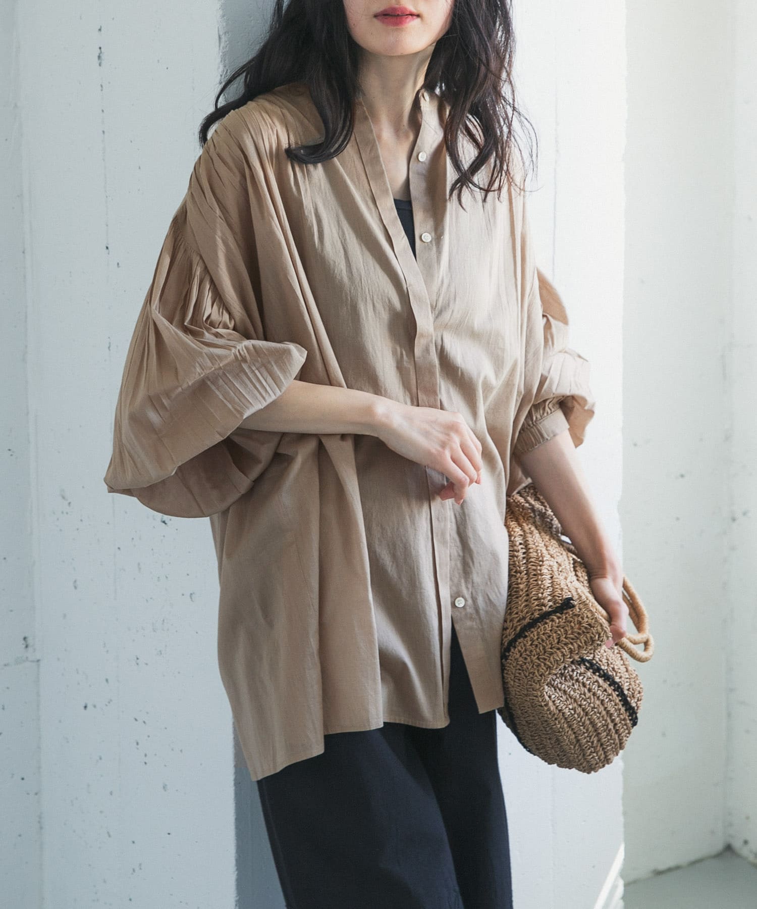 肩回りのギャザーや、ゆったりとしたシルエットが程よいボリュームを生み出すアイテム。
