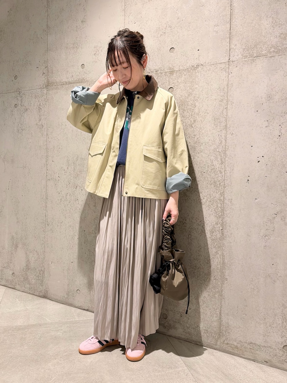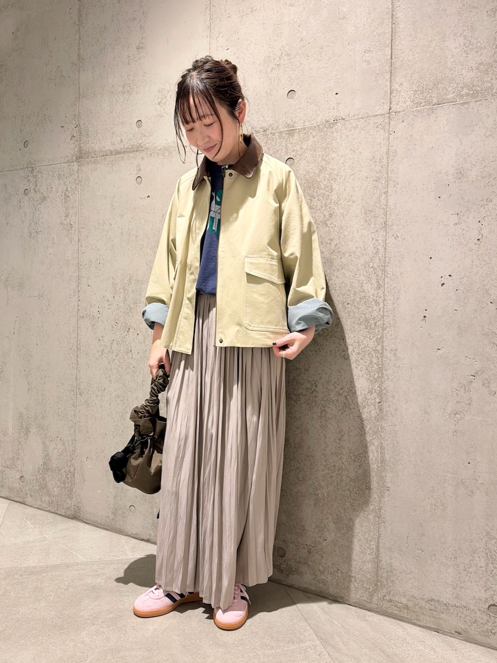 カジュアル過ぎないように、プリーツスカートで女性らしさをプラス。