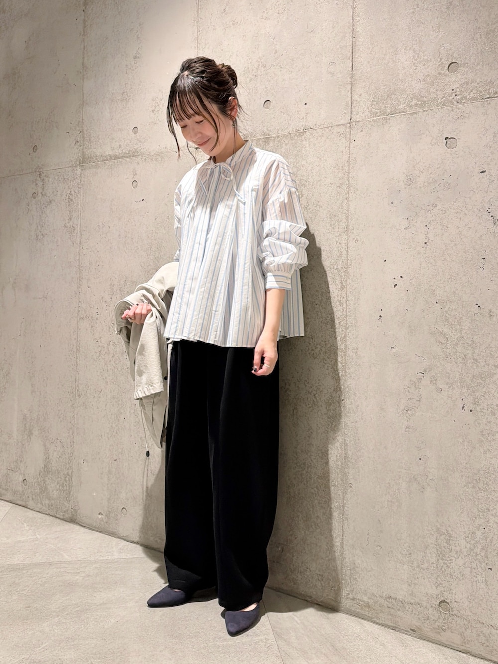 今回は、首元のリボンがポイントのストライプ柄ブラウスと合わせた、きれいめコーディネートです。