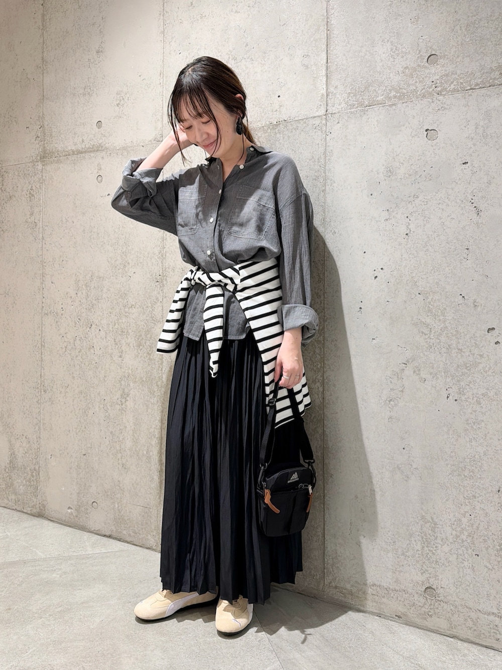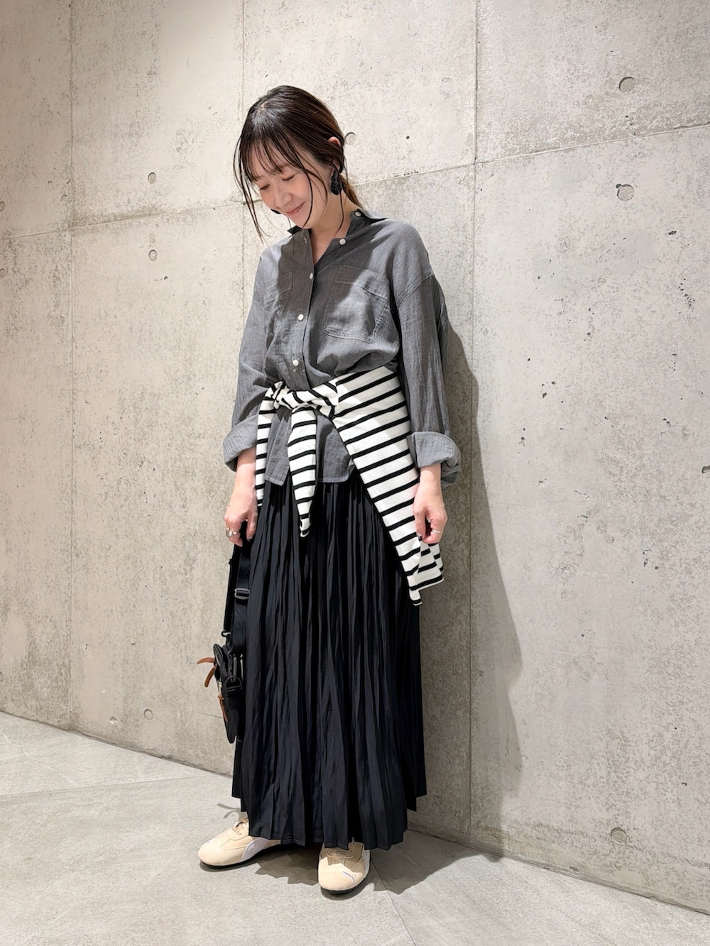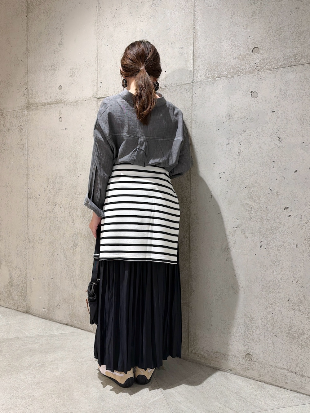 今回は、プリーツスカートを合わせた、モノトーンコーディネートです。